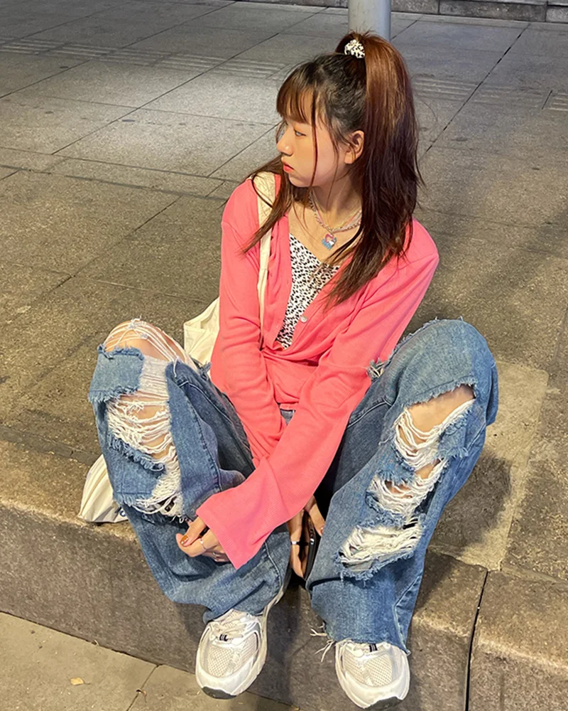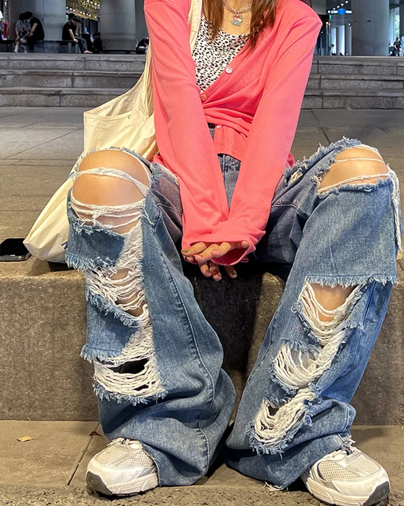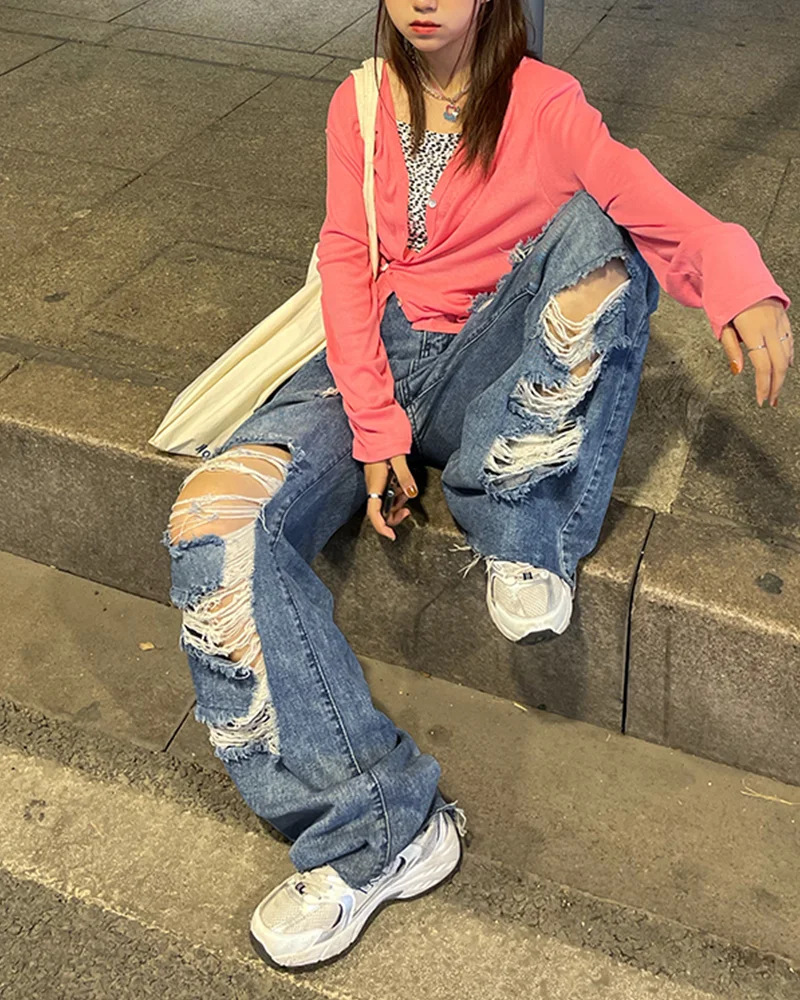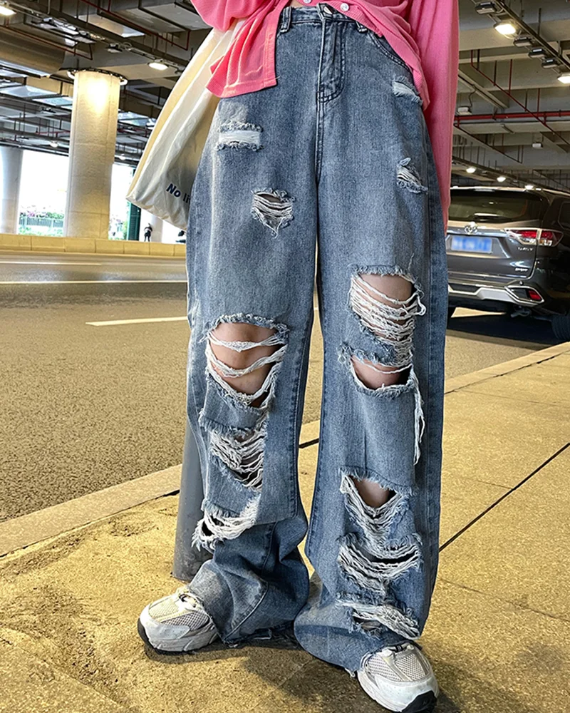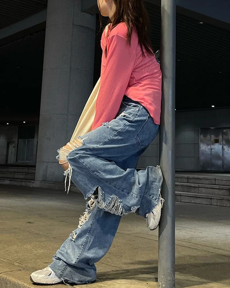 Yeknu Spring and Autumn Women's street jeans Ripped jeans High waisted baggy jeans Wide leg jeans Y2K hip hop pants Blue fashion jeans