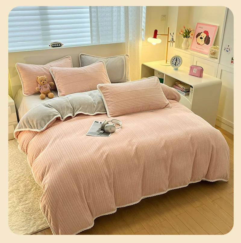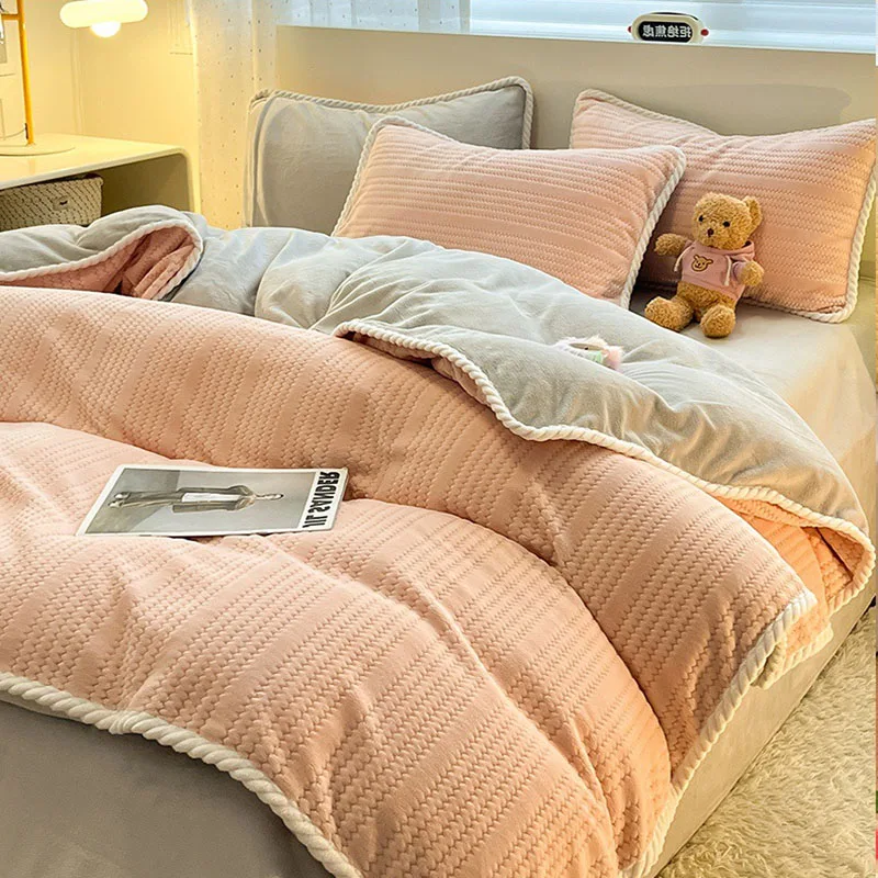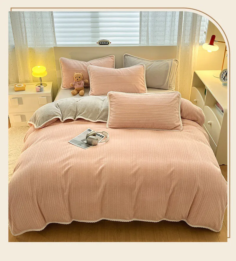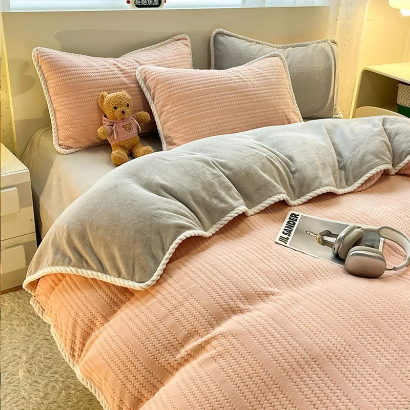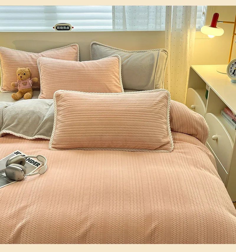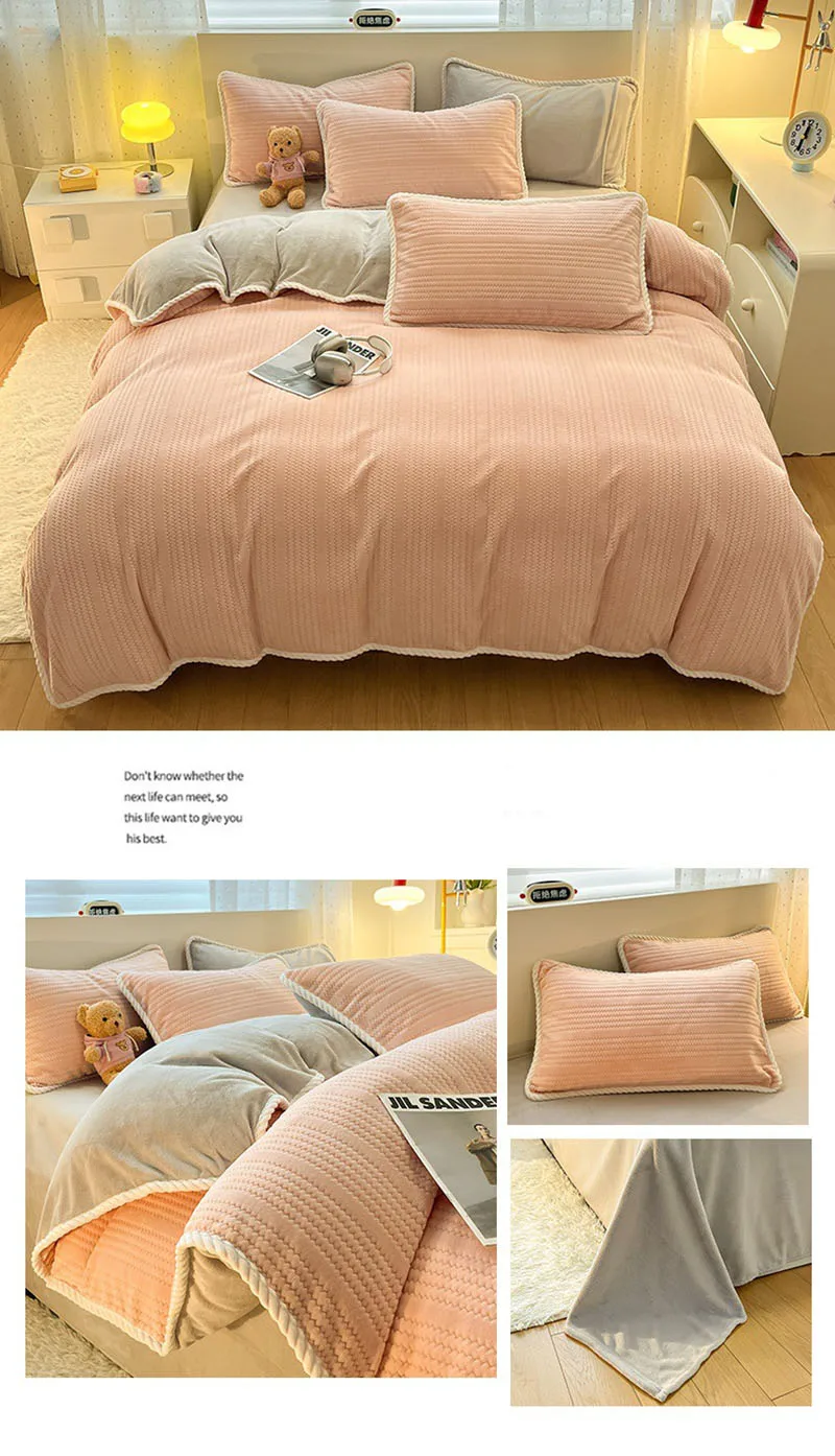 Yeknu Autumn and Winter Thick Milk Velvet Quilt Cover Striped Jacquard Double-Sided Flannel Duvet Cover Solid Color Cozy Warm Bedding