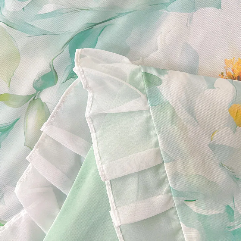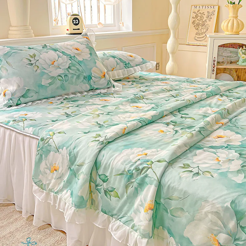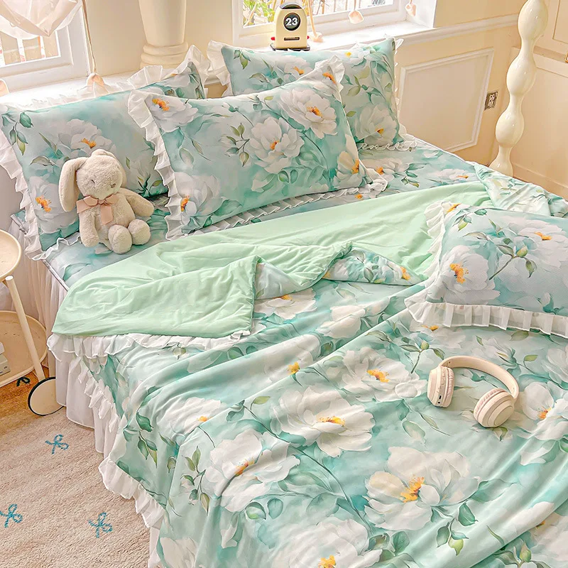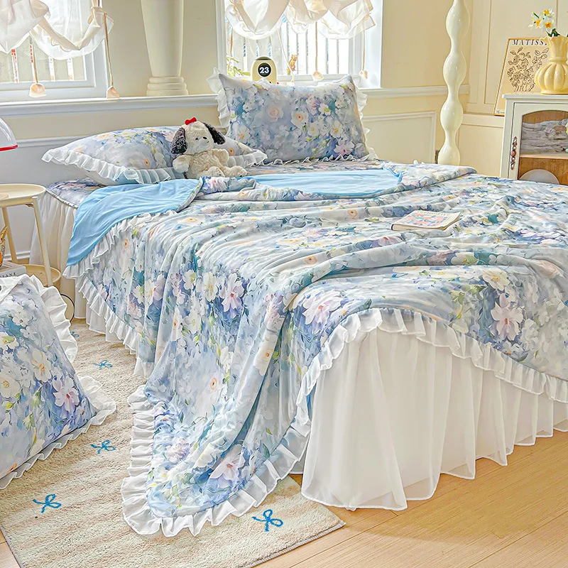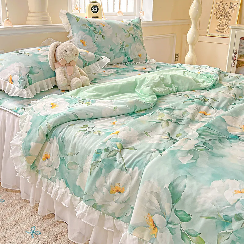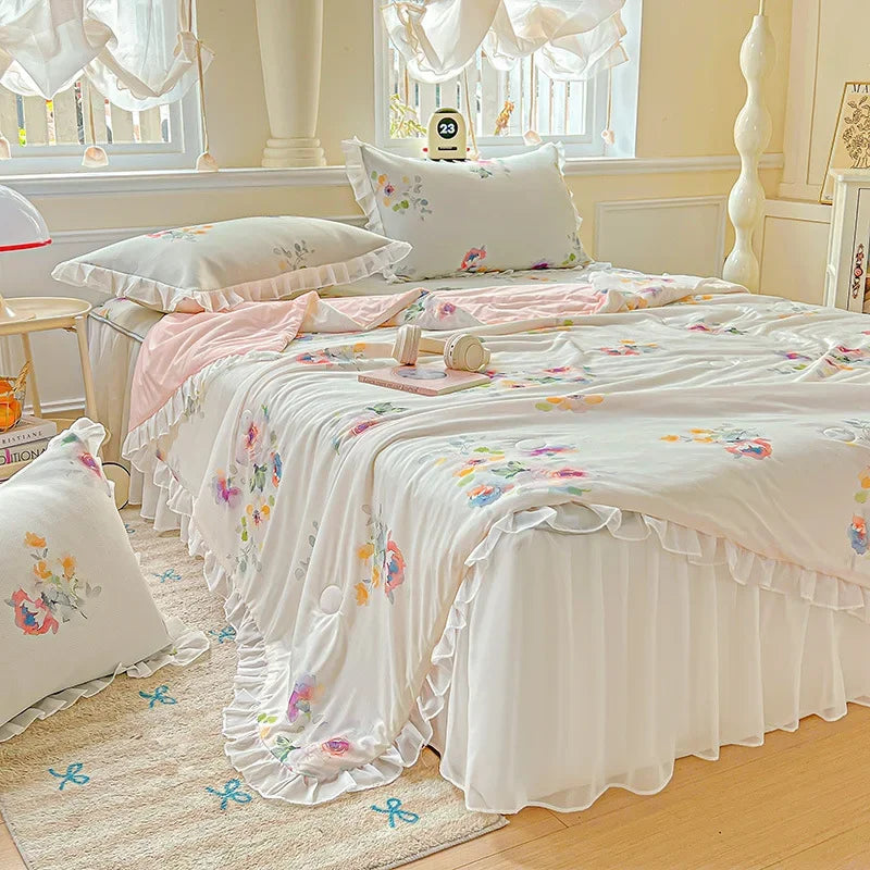 Yeknu Sweet Floral printed Cool Summer blanket Lace and Ruffle Quilt for Home Skin-Friendly breathable air conditioner Comforters