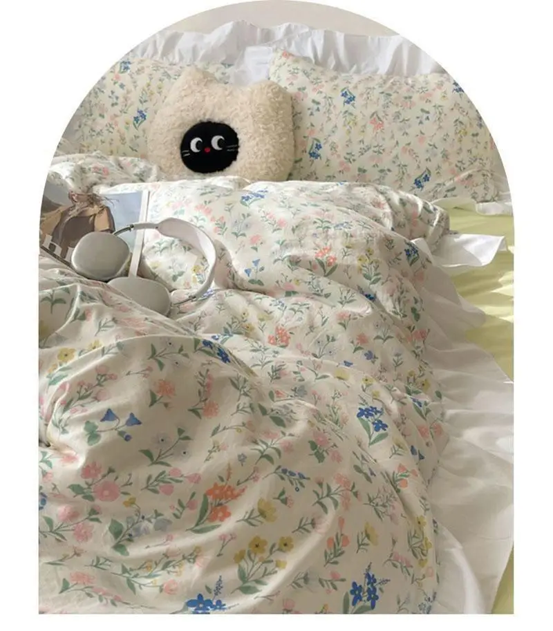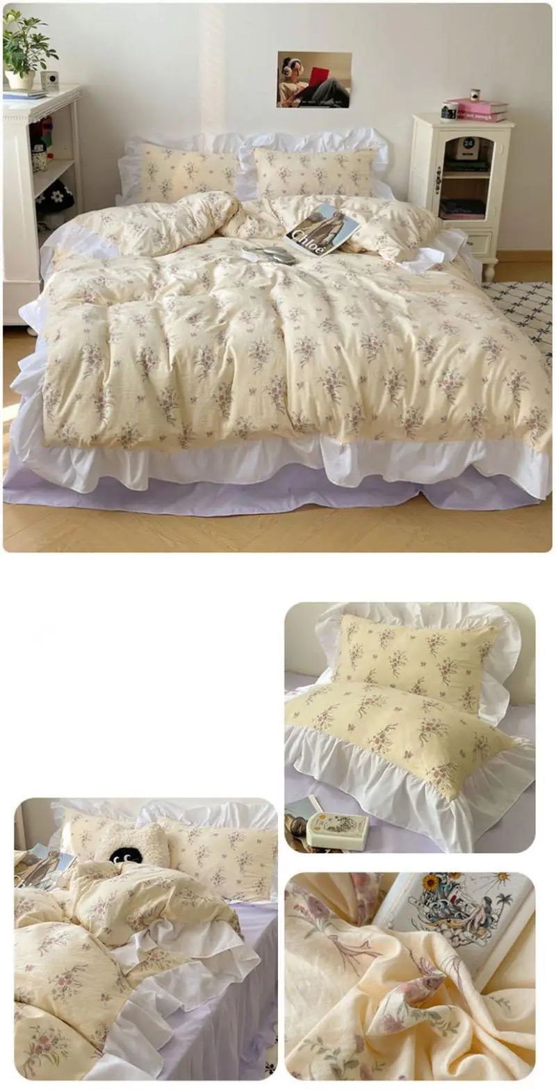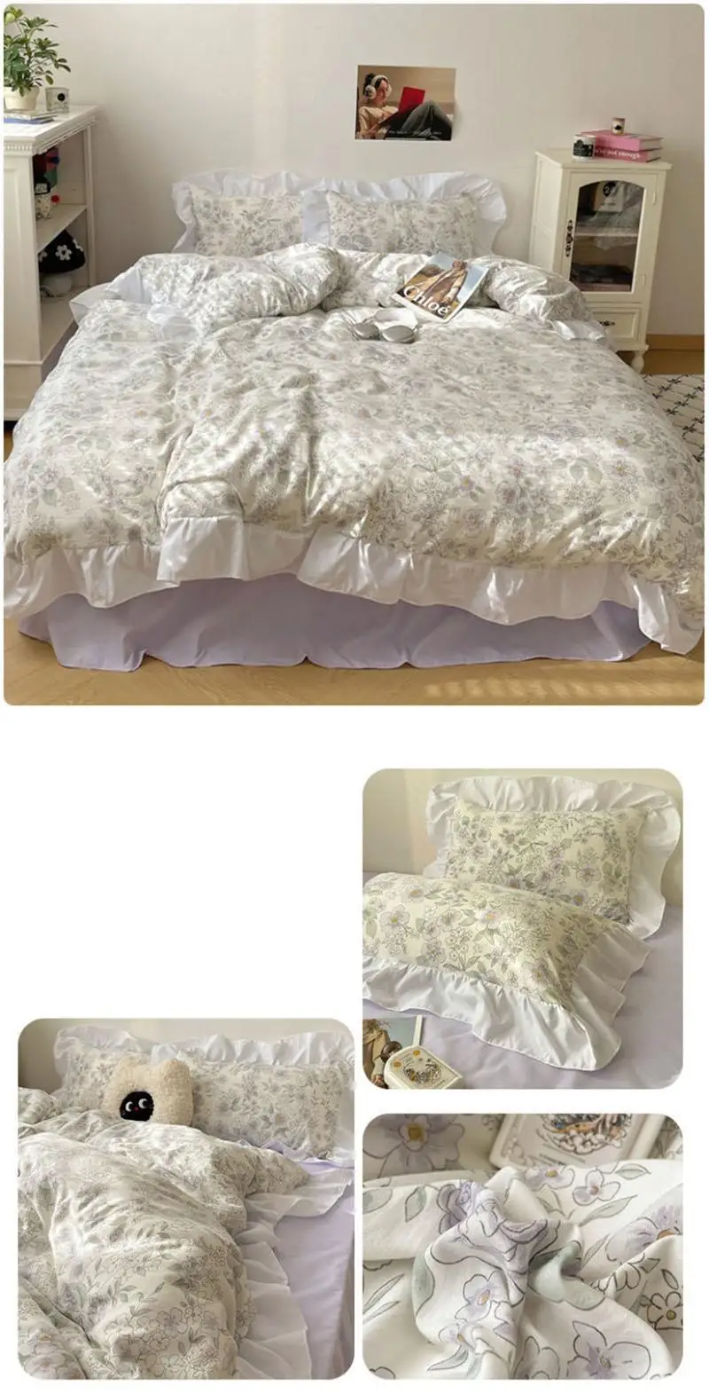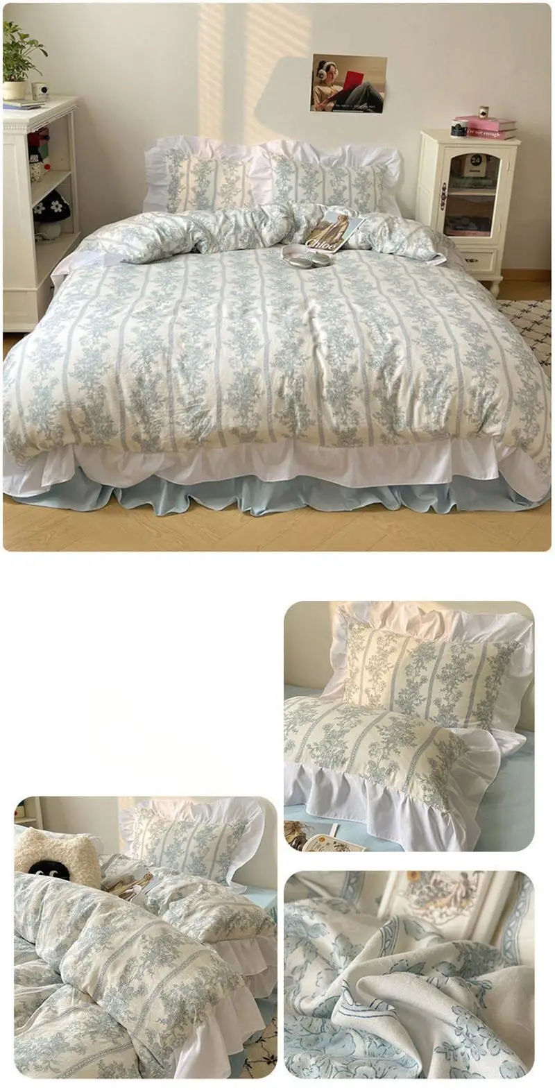Yeknu Korean Princess Style Lace Bedding Sets Washed Cotton Soft Fitted Sheet Duvet Cover Pillowcase Full Double Size Bedclothes