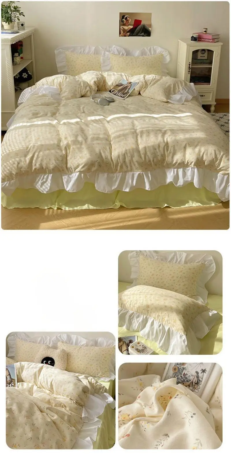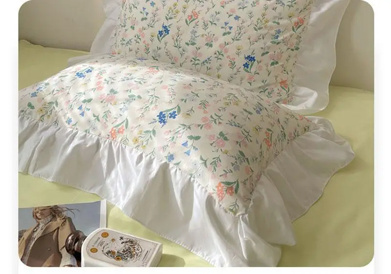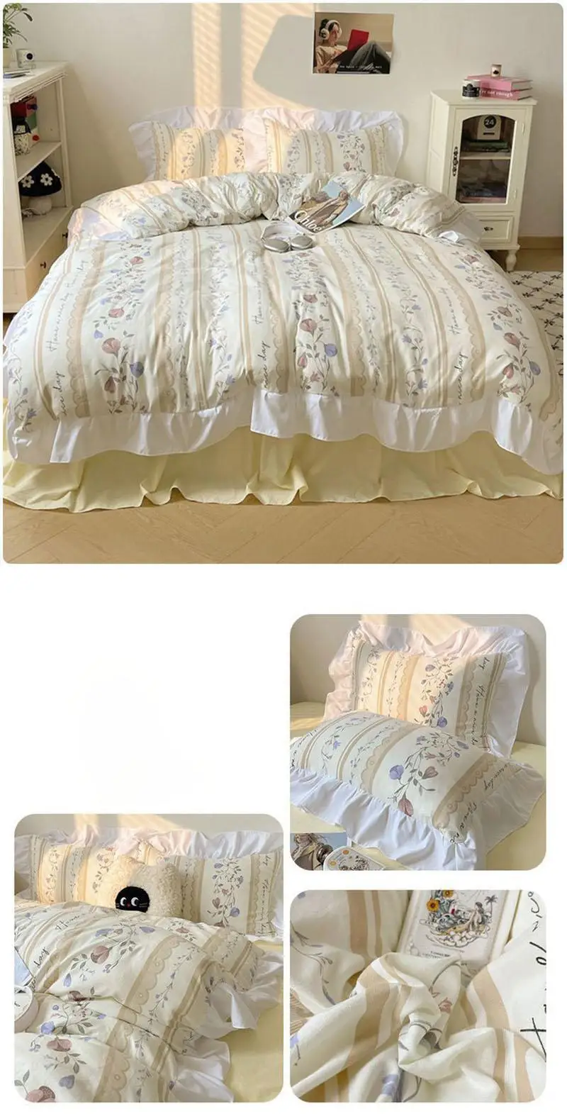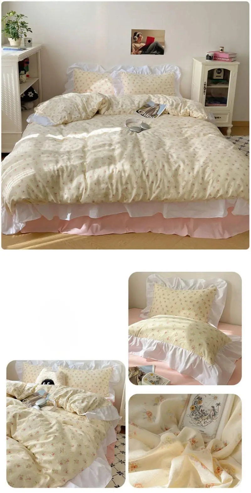Yeknu Korean Princess Style Lace Bedding Sets Washed Cotton Soft Fitted Sheet Duvet Cover Pillowcase Full Double Size Bedclothes