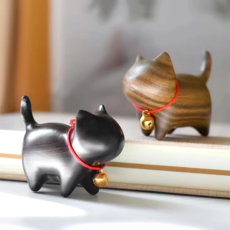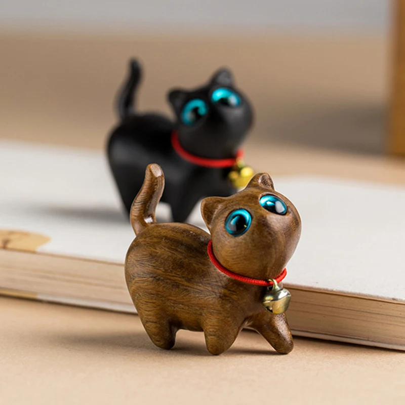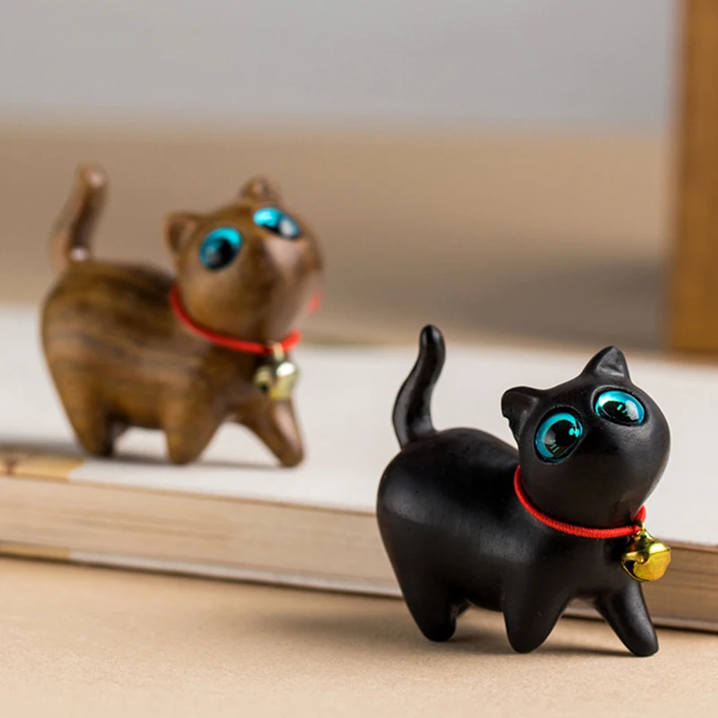 Yeknu Mini Cute Cat Ornaments Sandalwood Hand-Carved Wooden Cat Kitten Figures Miniatures Model Room Home Desktop Decoration Sculpture