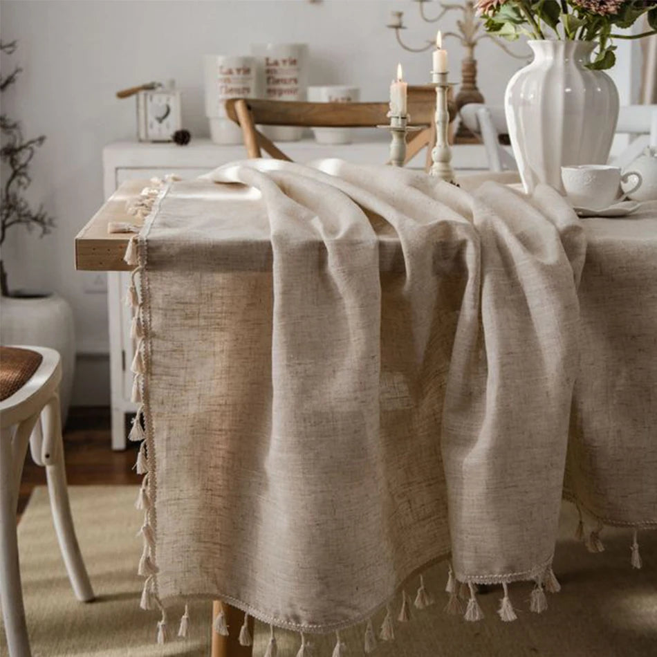 Yeknu Linen blend Tablecloth,Rectangle Tassel,Jute Rope Lace Dust-Proof Table Cover,for Kitchen Dinning Party Tea Table Decoration