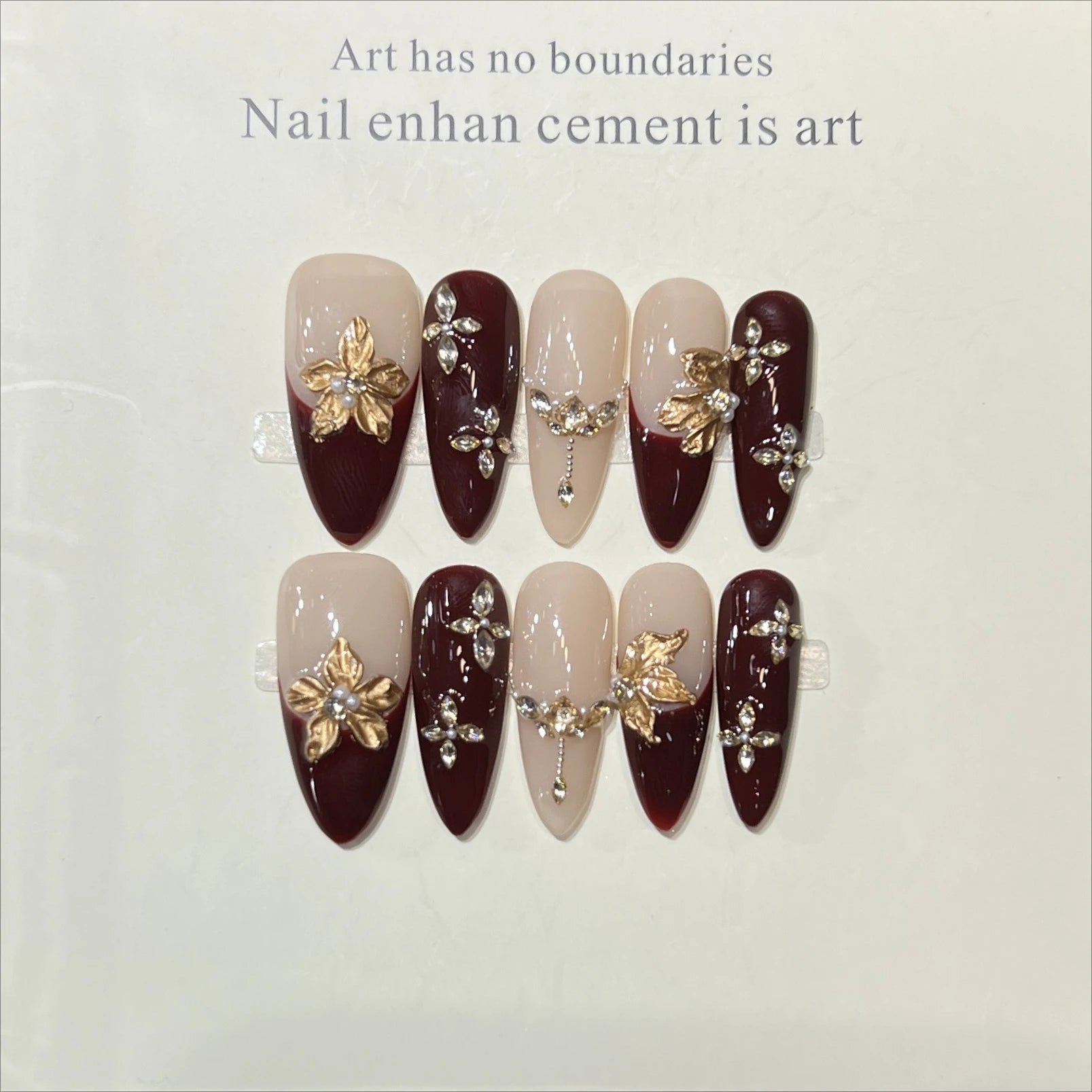 Yeknu 10pcs Cat Eye Press on Nails Carved Flower False Nails Glitter Rhinestone Pearl Acrylic Nail Art French Almond Gentle Fake Nails