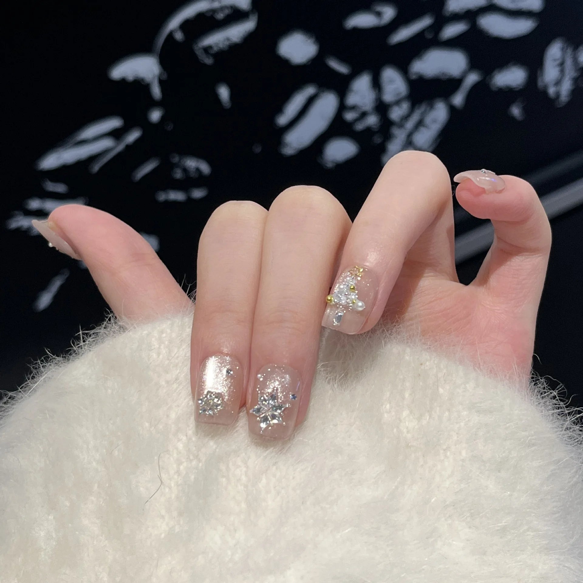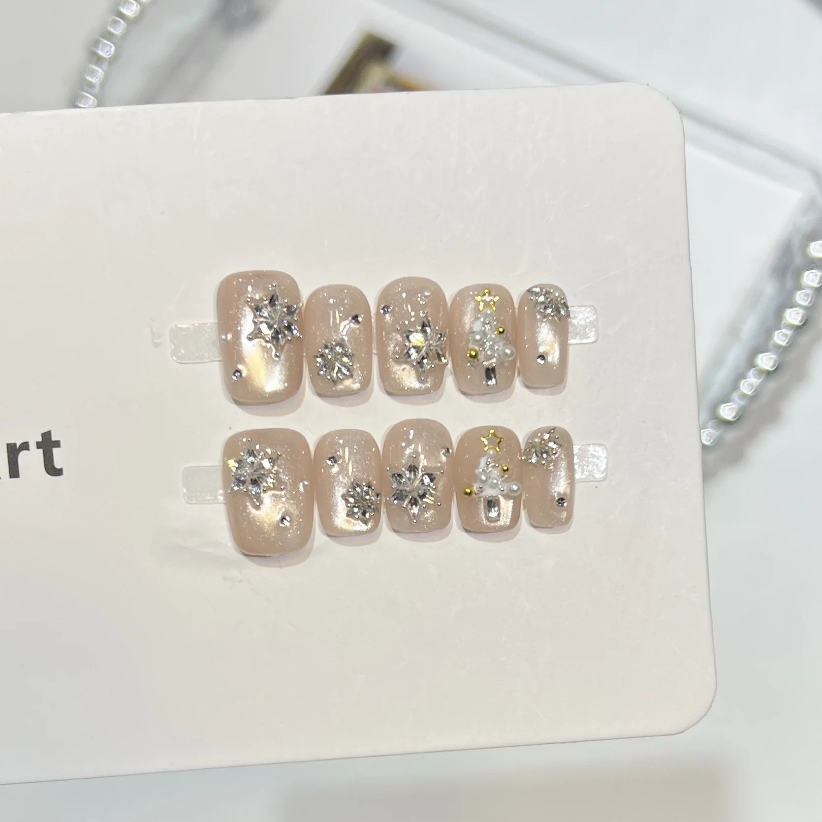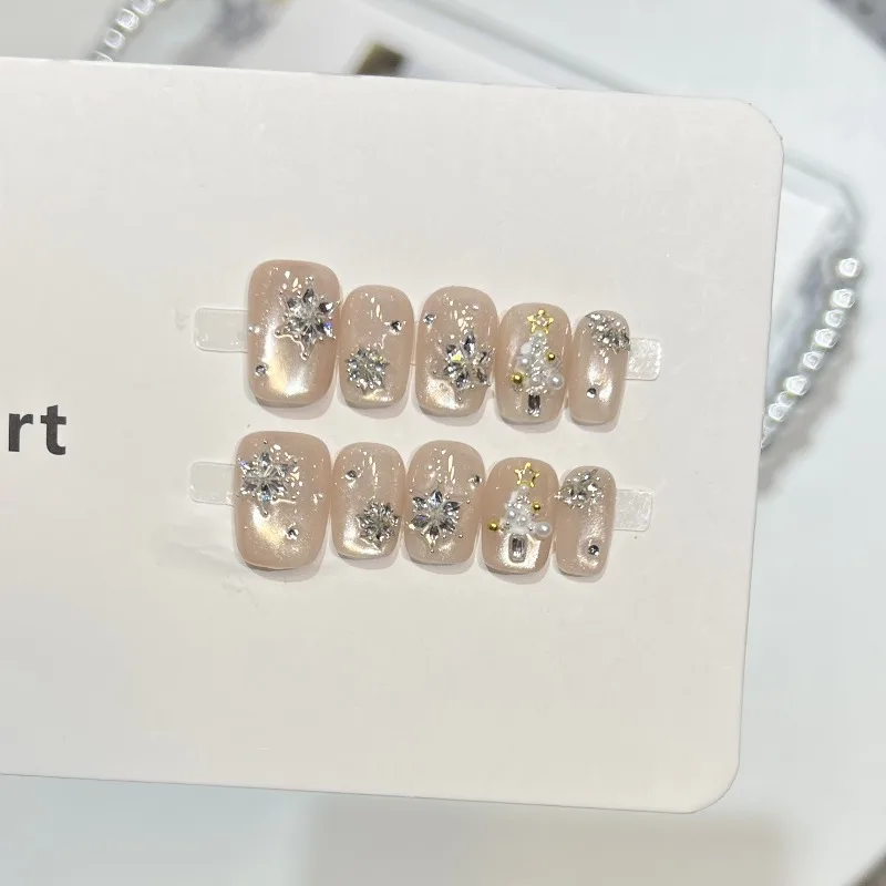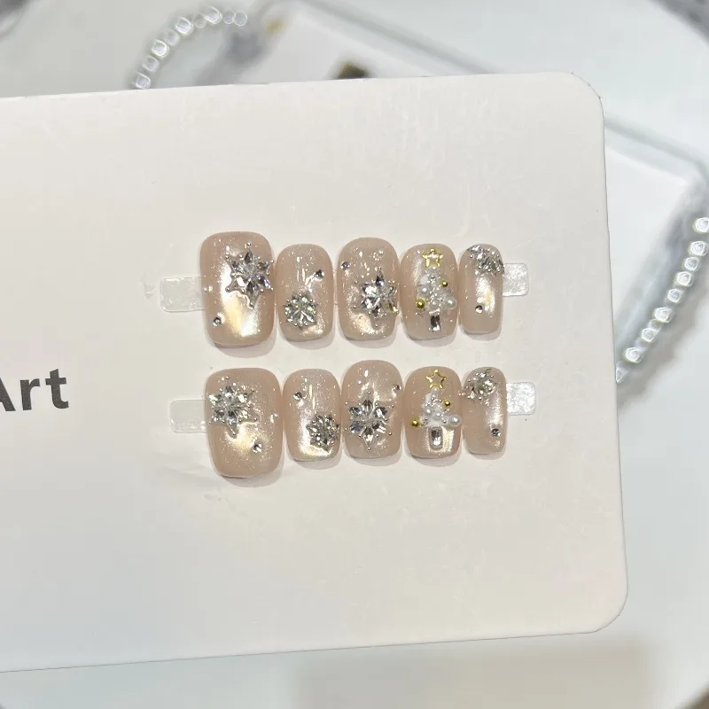 Yeknu 10Pcs Cat Eye Press on Nails Nude Color Short Square False Nails Zircon Snowflake Pearl Manicure Nail Glitter Diamond Fake Nails