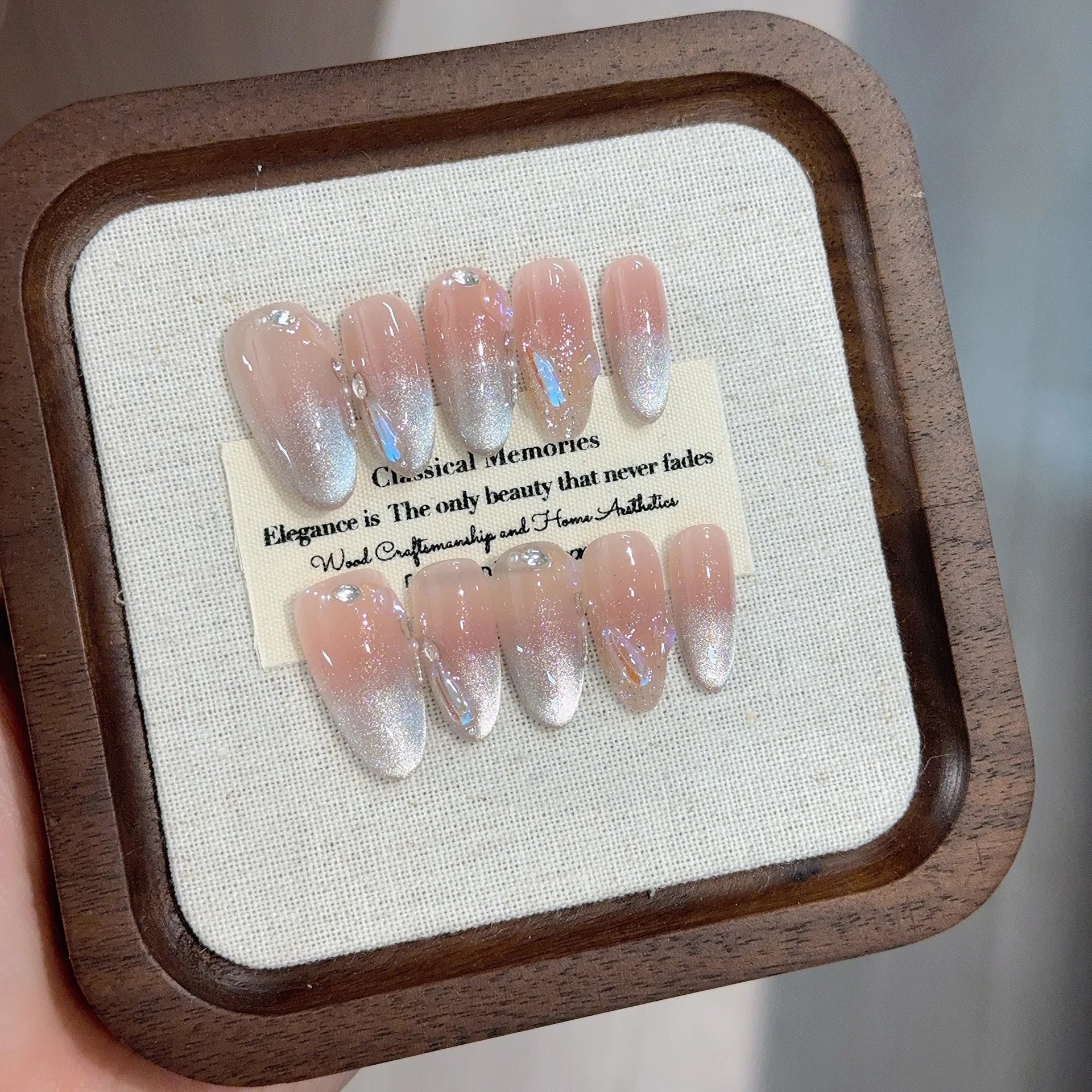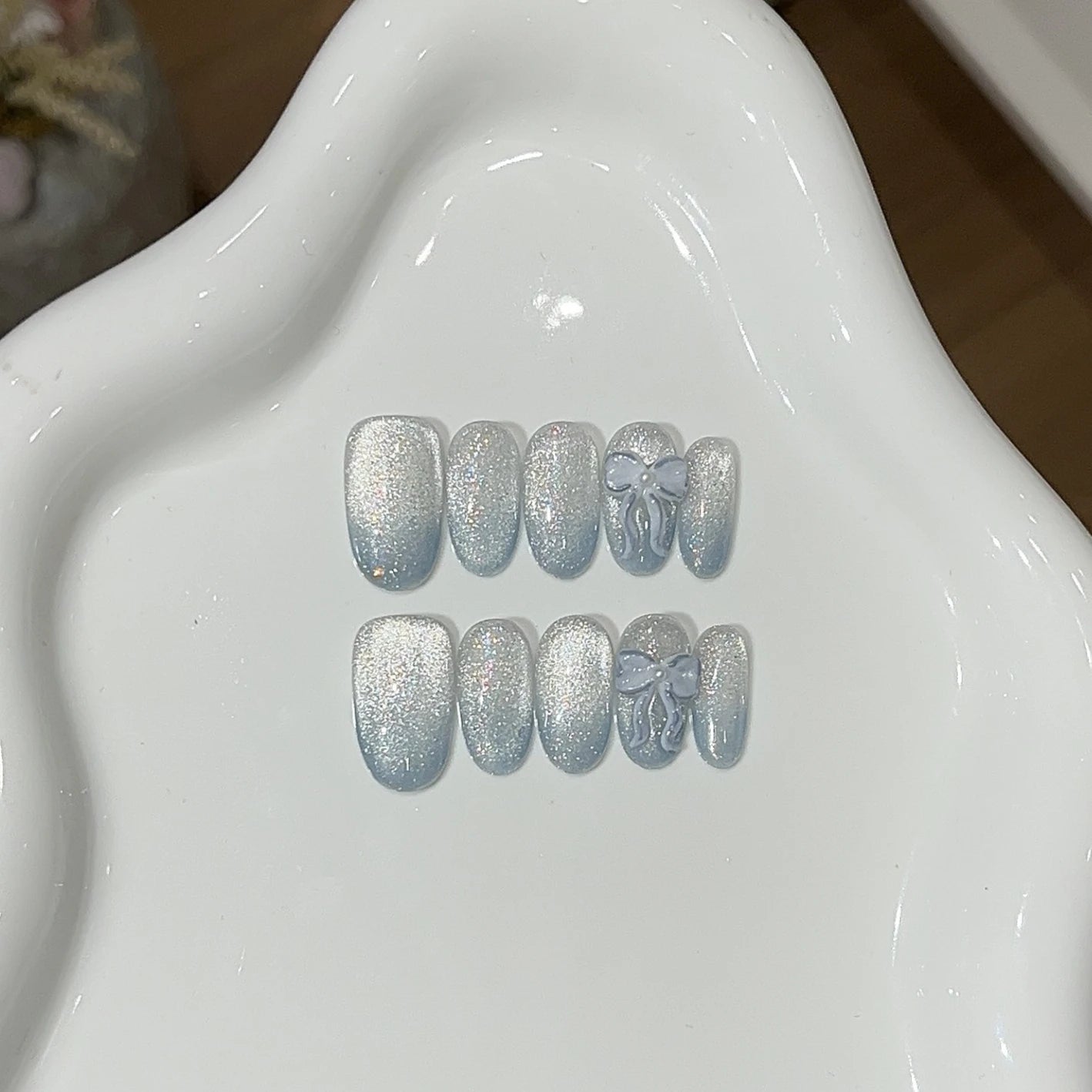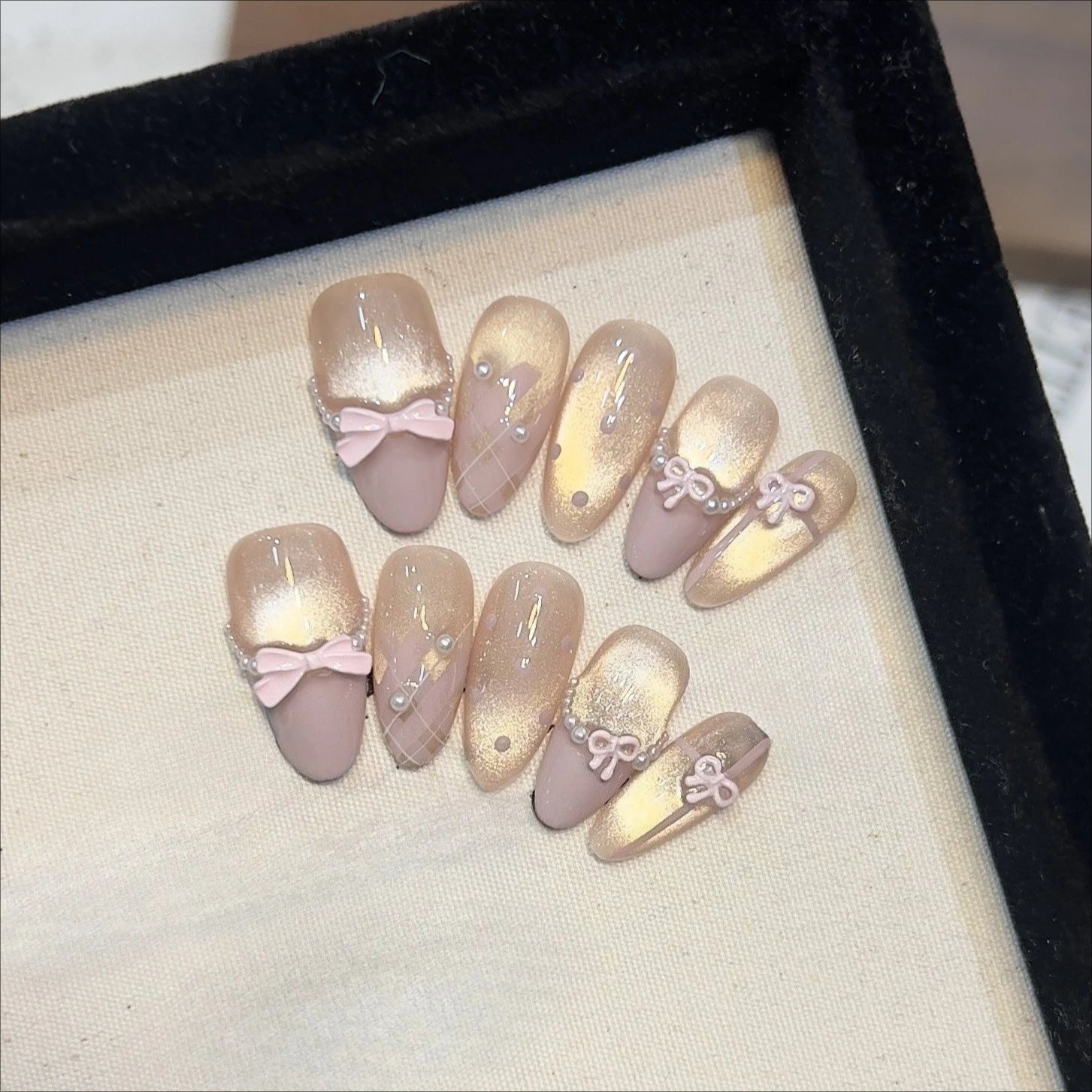 Yeknu  10Pcs Crystal Cat Eye Press on Nails Polka Dots Nail Creme Ballet Delicate Bowknot False Nails Sweet French Almond Fake Nails