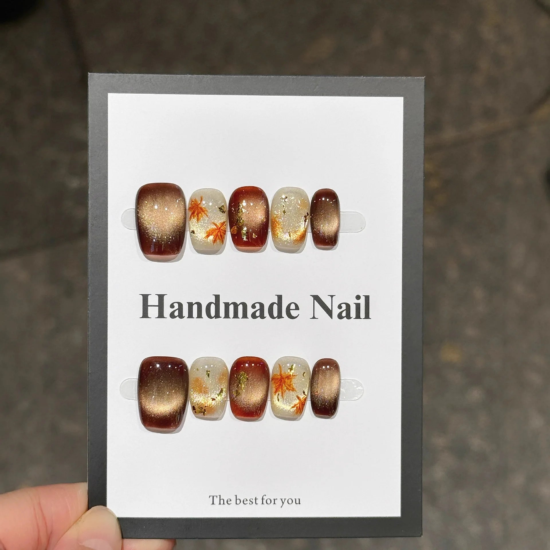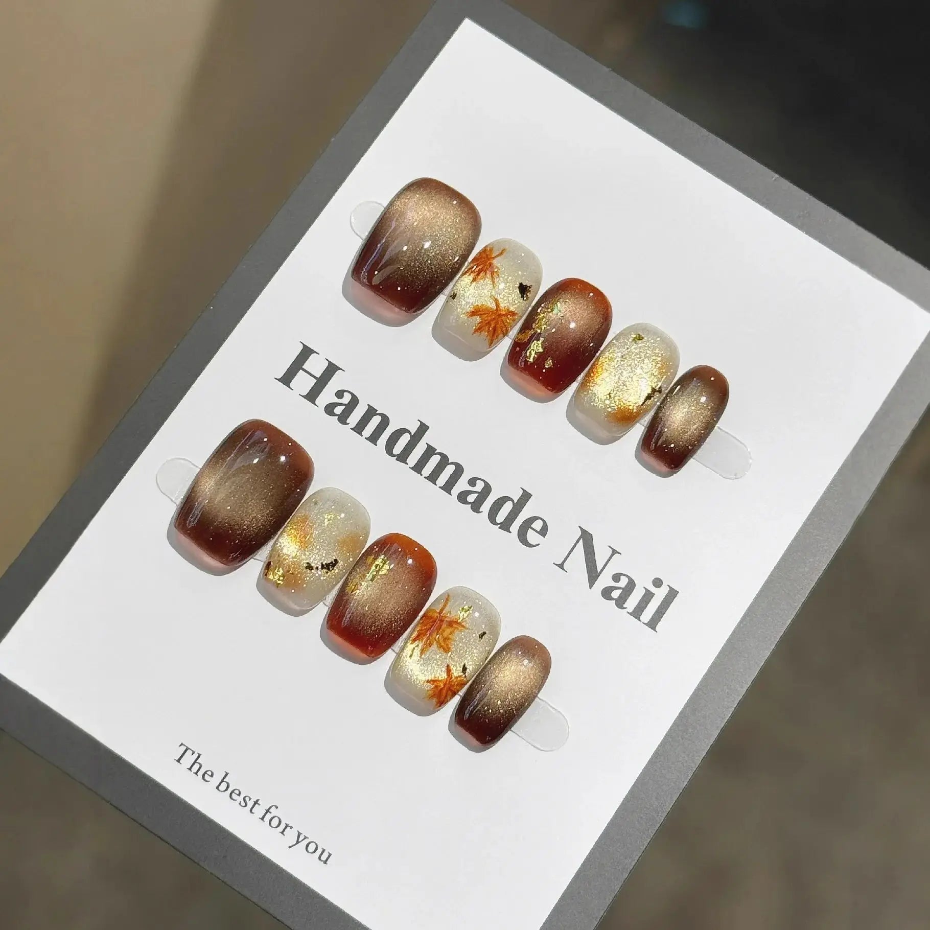 Yeknu 10pcs Maillard Press on Nails Maple Leaf False Nails Crystal Cat Eye Sparkling Nail Brown Handmade Wearable Coffin Fake Nails