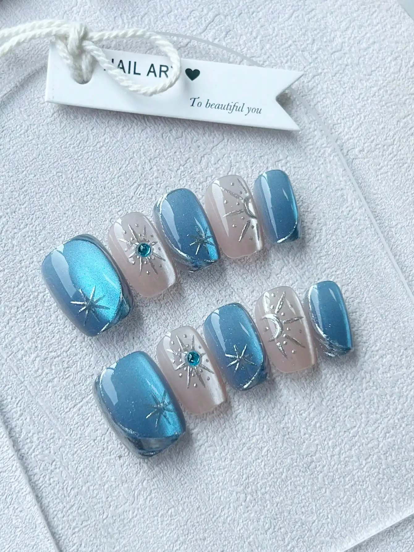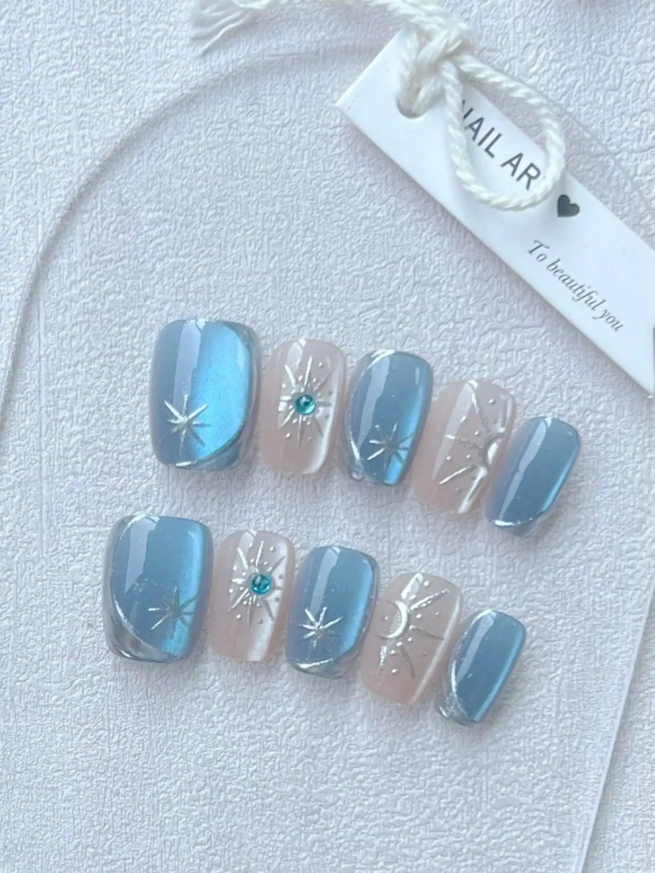 Yeknu 10pcs Short Square Star Iridescent Blue Cat Eye Nail Art Tips, Ballet Style, Removable, Elegant Nail Dress Up,Suitable For Party