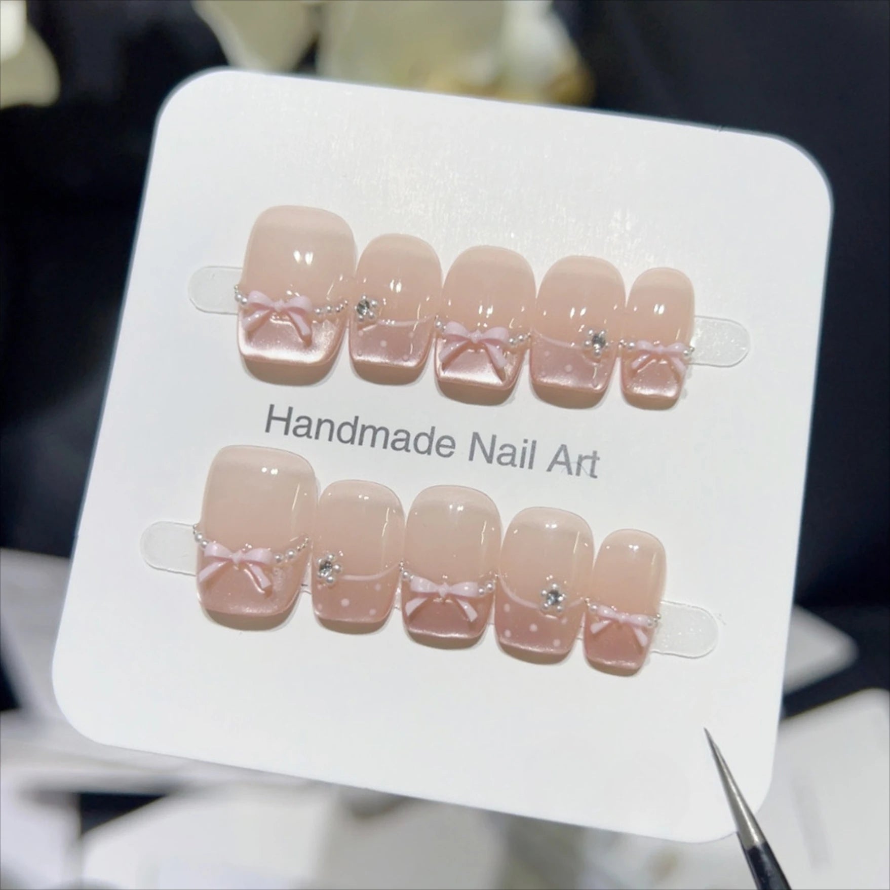 Yeknu 10pcs Summer Sweetheart Press on Nails Gentle Cat Eye Fake Nails 3D Bow Heart Rhinestone False Nails French Square Nail Art Tip