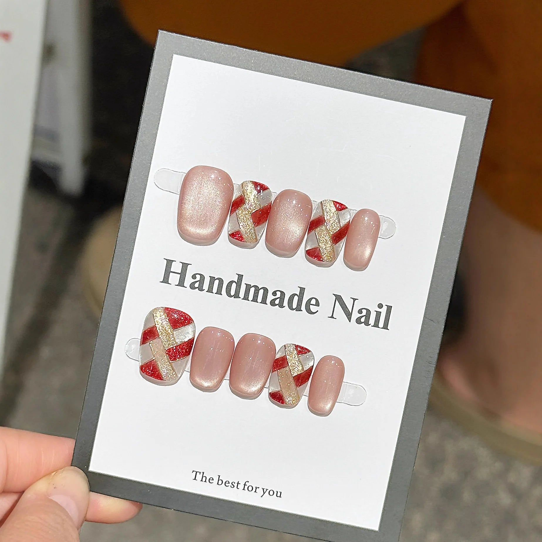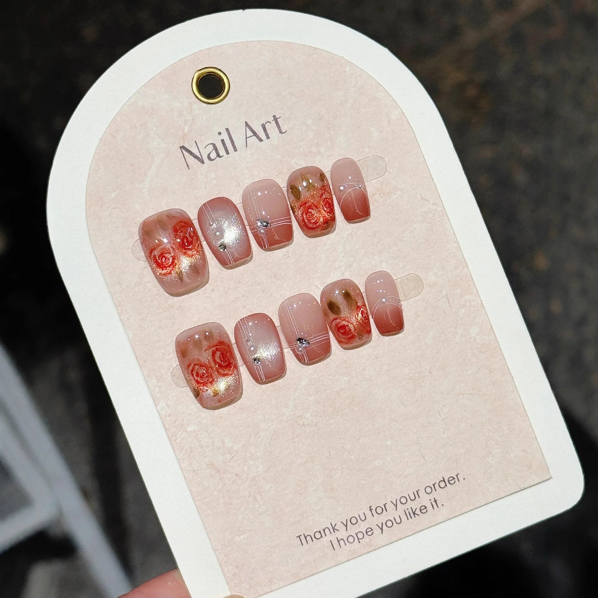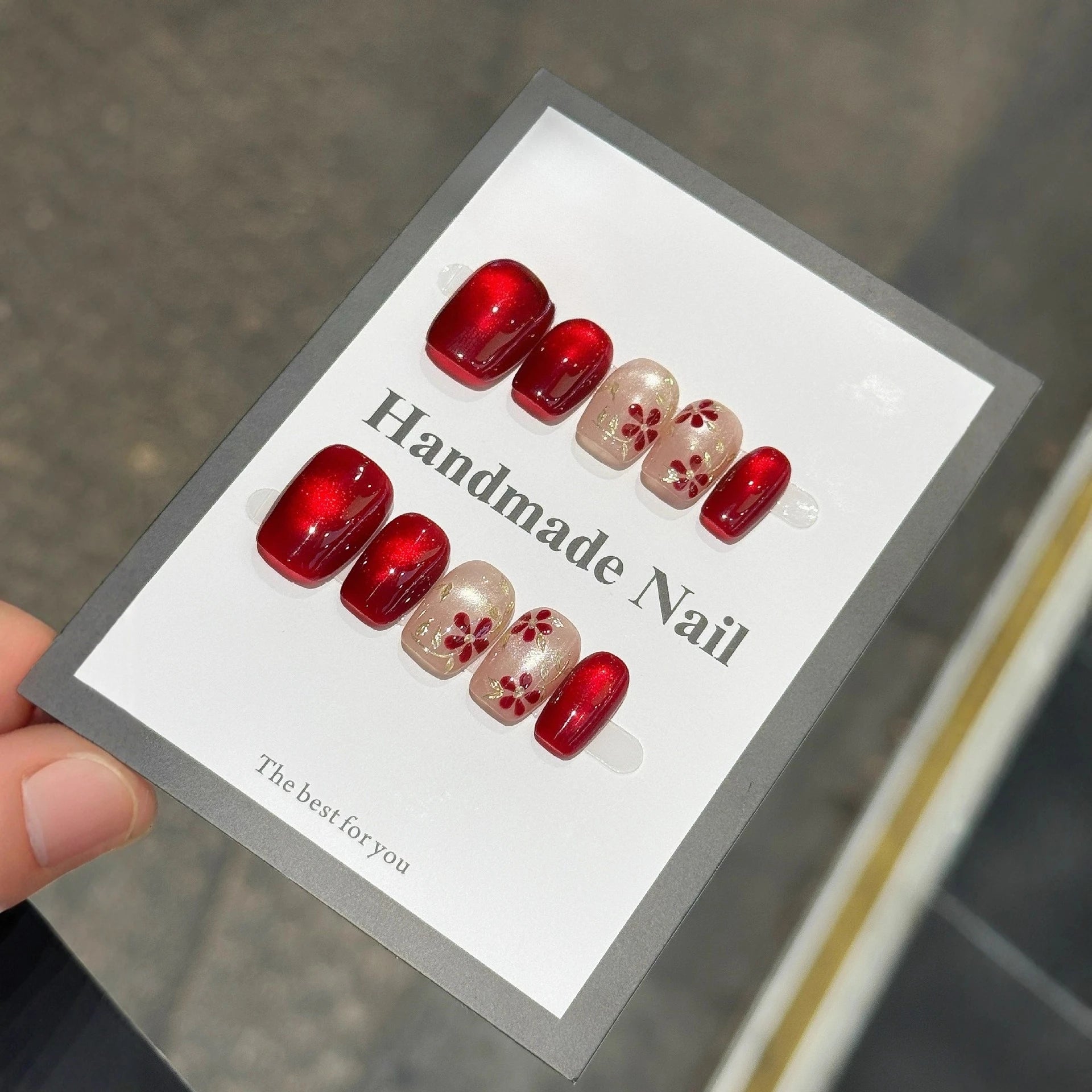 Yeknu 10pcs Ruby Cat Eye False Nails Handmade Sparkly Glitter Press on Nails Elegant Temperament Nail Art Rose Flower Nail for Women