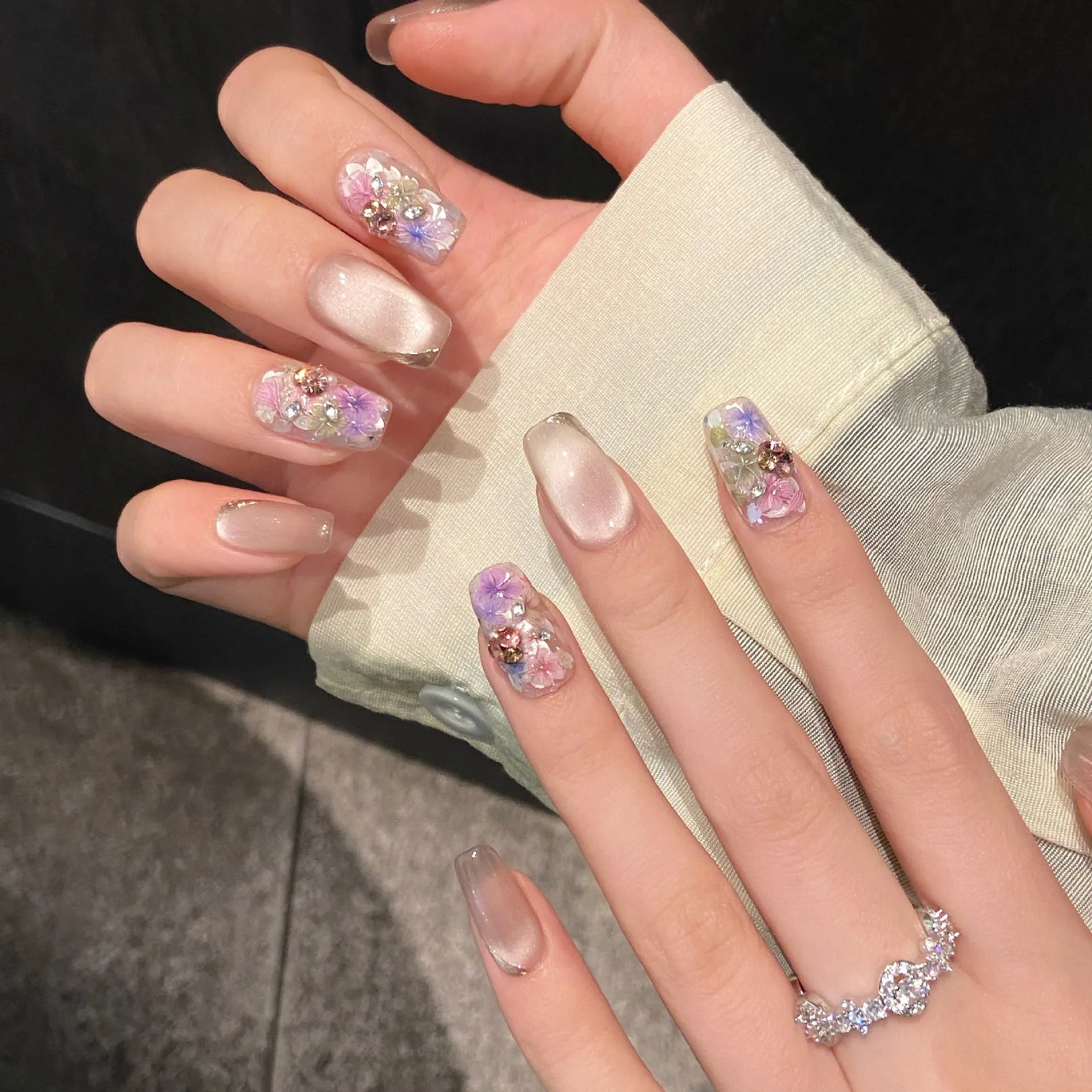 Yeknu 10Pcs Handmade Press on Nails Full Cover Cat Eye Rhinestone Design Nude Color French Ballerina False Nails Manicure Nail Tips