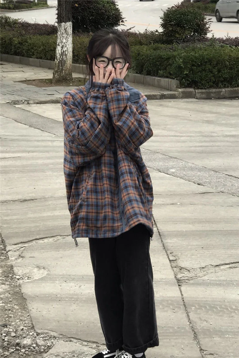 Yeknu Reversible jacket for women Korean loose autumn new multi-pocketed jacket Harajuku retro gown shirts preppy campus hip hop coat
