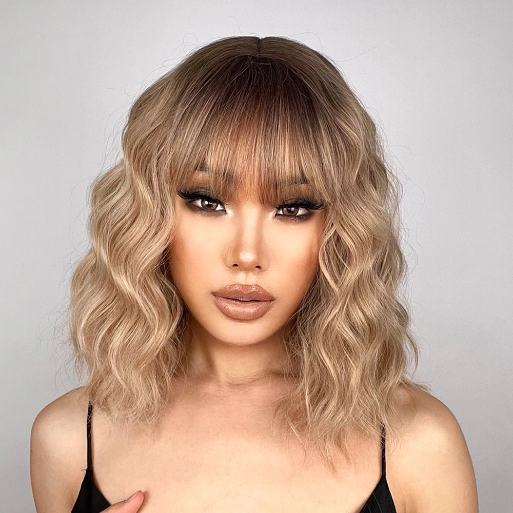 Yeknu Short Bob Wavy Synthetic Wig For Women With Bangs Blonde Ombre Medium Wig Heat Resistant Fiber Hair Party Cosplay