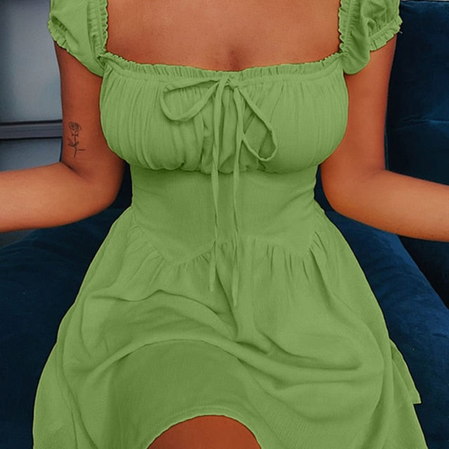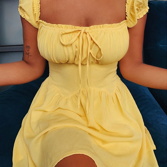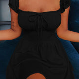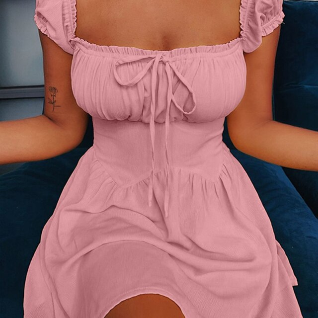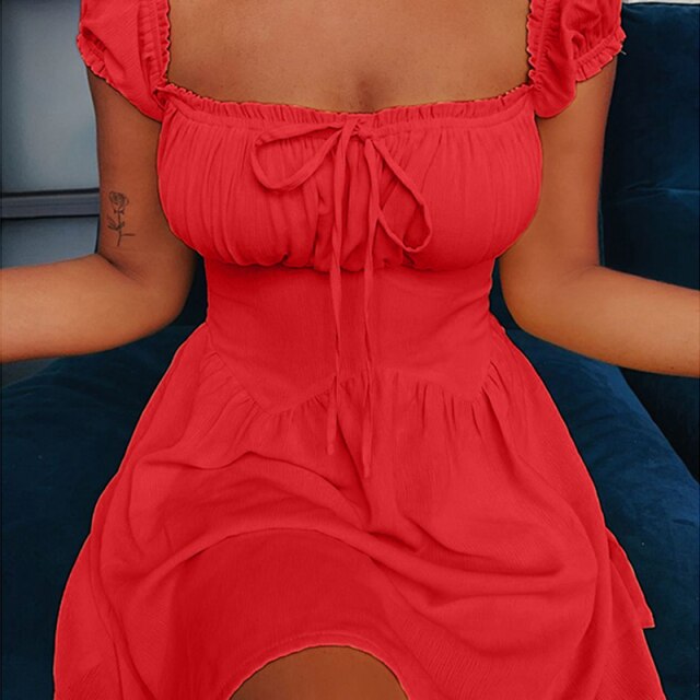 Yeknu Summer Sweet Fashion Casual Women Square Neck Tie Detail Dress Gathered Bust Fitted Bodice Plus Size Neckline Dresses