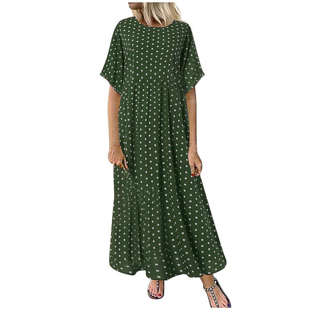 Yeknu Women Sundress Vintage O-Neck Long Maxi Dress Female Casual Dot Pinted Summer Dress Beach Boho Dresses Vestidos Robe