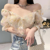 Yeknu French Floral Dress Women Sexy Puff Sleeve Lace Chiffon Print Mini Dress Women Summer Korean Style Vintage Fairy Dress New