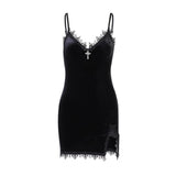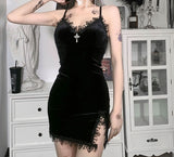 Yeknu Gothic Dark Cross Black Mini Dress Vintage Sexy Spaghetti Strap High Waist Slit Dresses Goth Party Club Women Dress