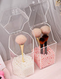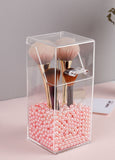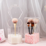 Brush Holder With Lid - Makeup brush holder with hinged design for easy opening and closing, and the lid of this brush holder ensures your makeup brush is not stained by dust. Comes with beautiful white and pink pearl beads to keep your makeup brushes upright.