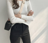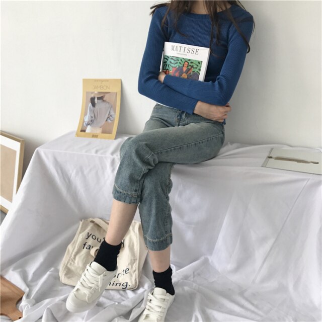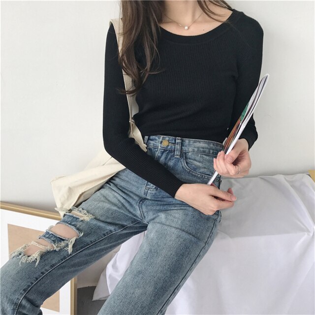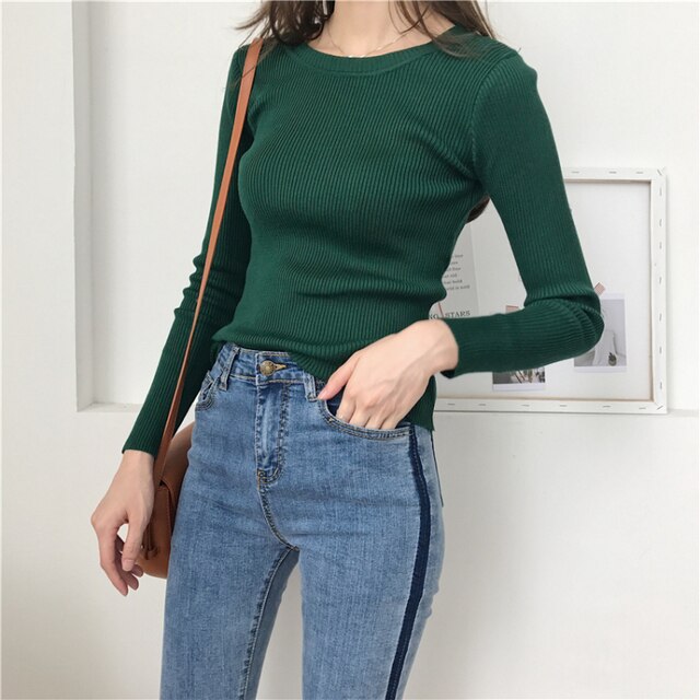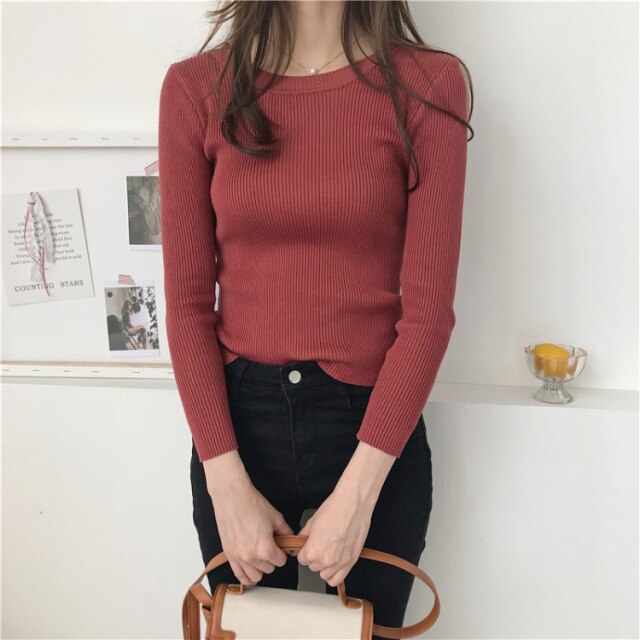 Yeknu Round Neck Rib Knittd Sweater Women Elastic Force Basic Slim Sweater Female Long Sleeve Jumpers Korean Fashion