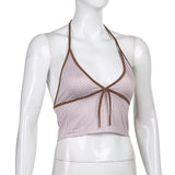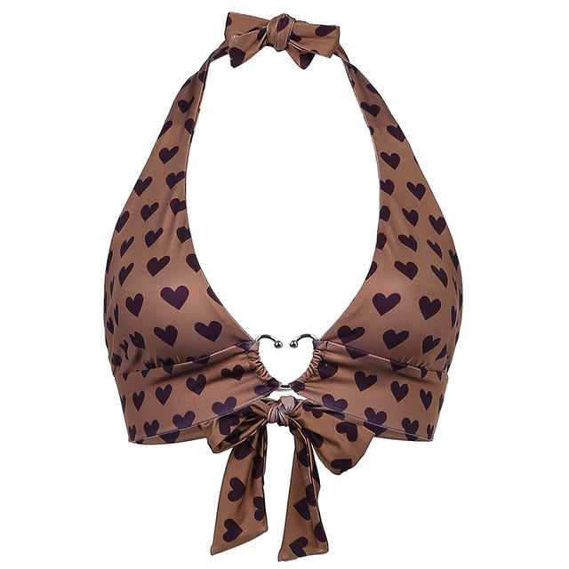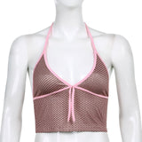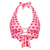 Yeknu Pink Heart Print Cute Bustier Crop Top Women Y2K Aesthetic Kawaii Clothes Sleeveless Backless Lace Up Bralette Camisole