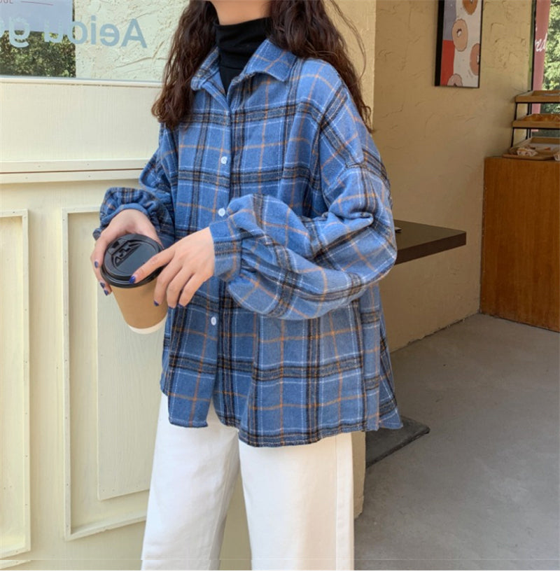 Yeknu Women Plaid Warm Shirt Female Jacket Checked Coat Casual Turn-down Collar Long Sleeve Autumn Blouse Fashion Loose Outwear Tops