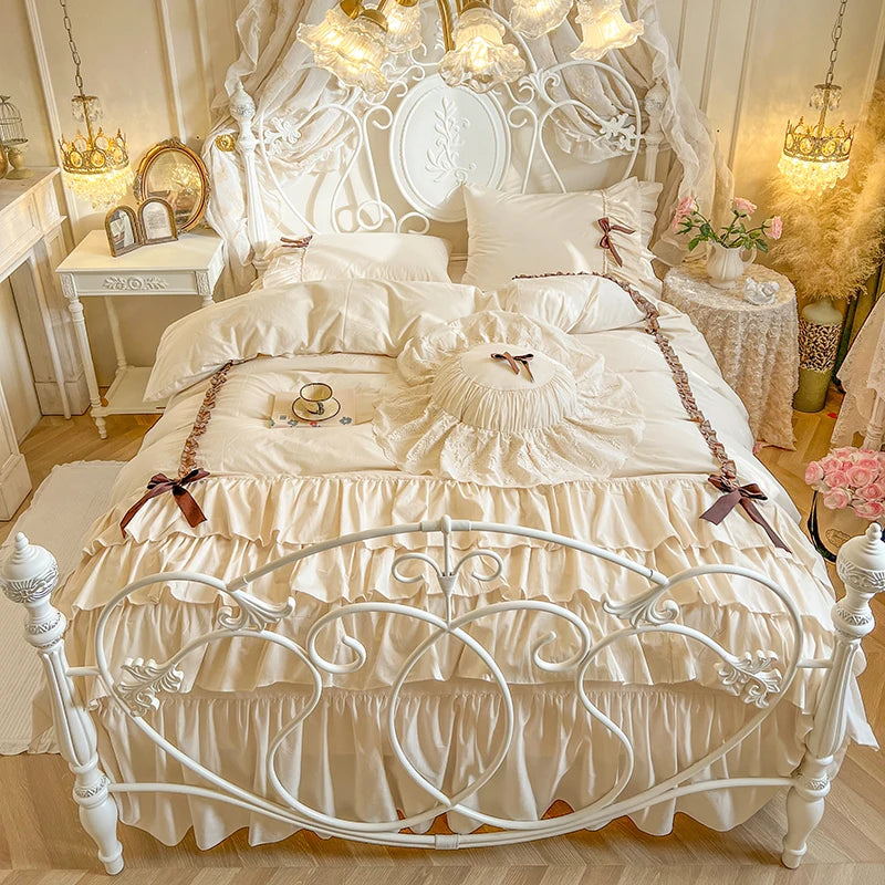Yeknu 100% Cotton Korean Princess Style Three-layer Ruffles Bow Bedding Set Duvet Cover Bed Skirt Bedspread Pillowcases Wedding Gifts