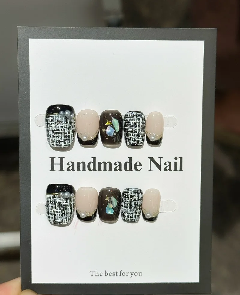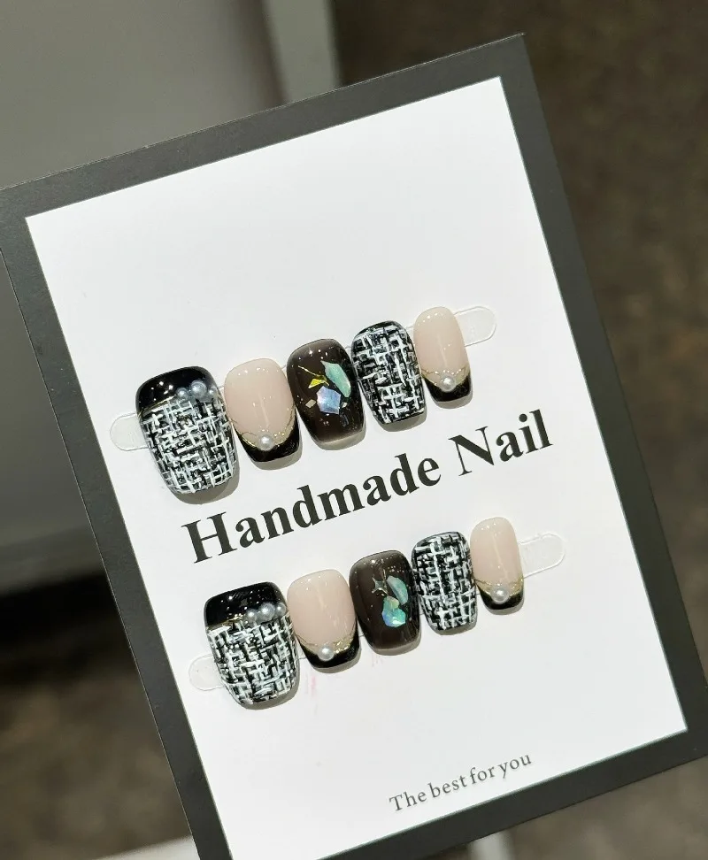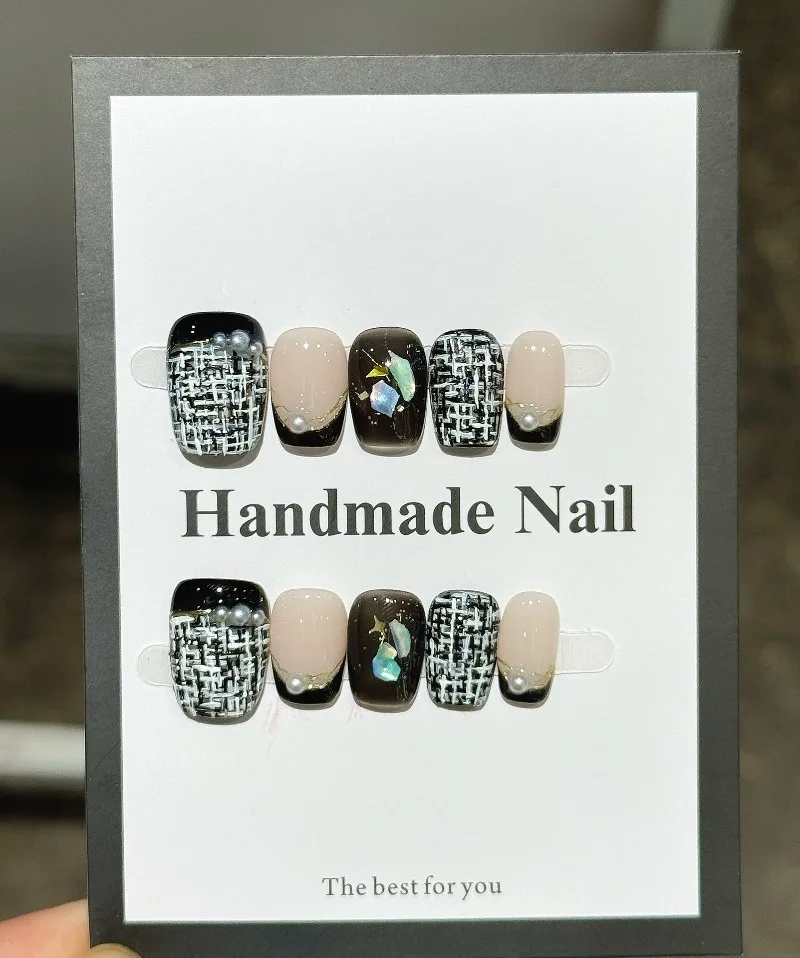 Yeknu 10pcs Black & White Plaid Stick on Nails Vintage French Press on Nails Short Coffin Nail Pearl Gold Flower Fake Nails Press On