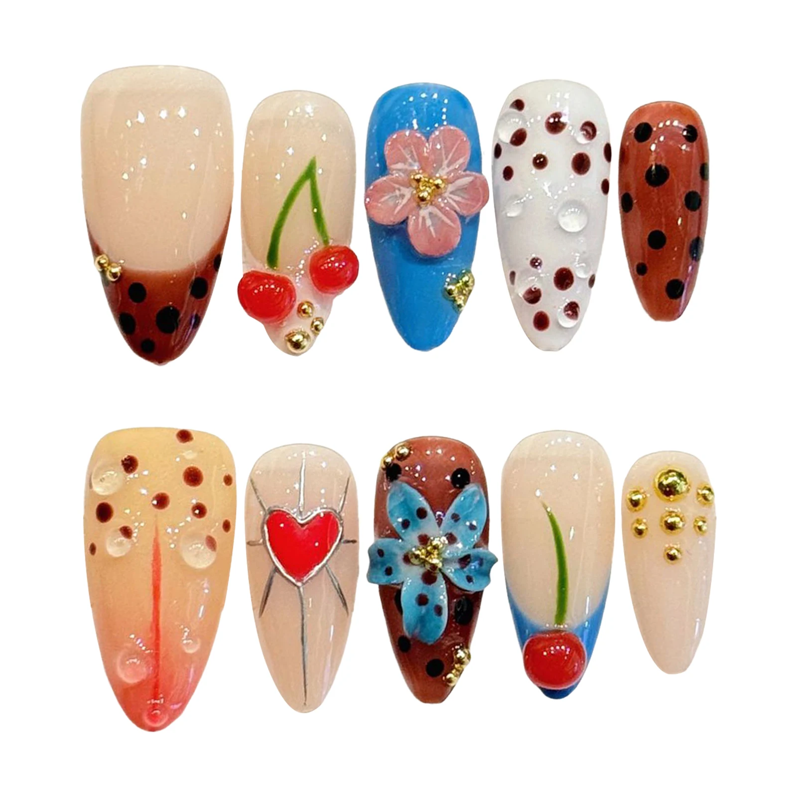 Yeknu 10Pcs Handmade Fake Nails 3D Sweet Cherry Flowers Decor Press On Nails Shiny Rhinestones French Almond Fake Nails Wearable