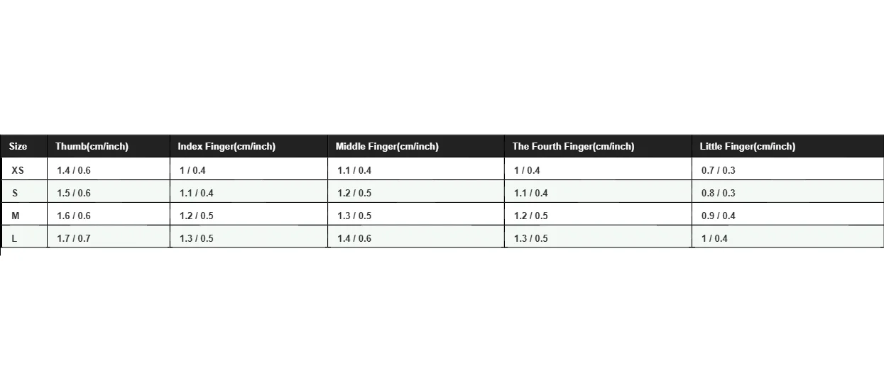 Size,Thumb,Index Finger,Middle Finger,The Fourth Finger,Little Finger