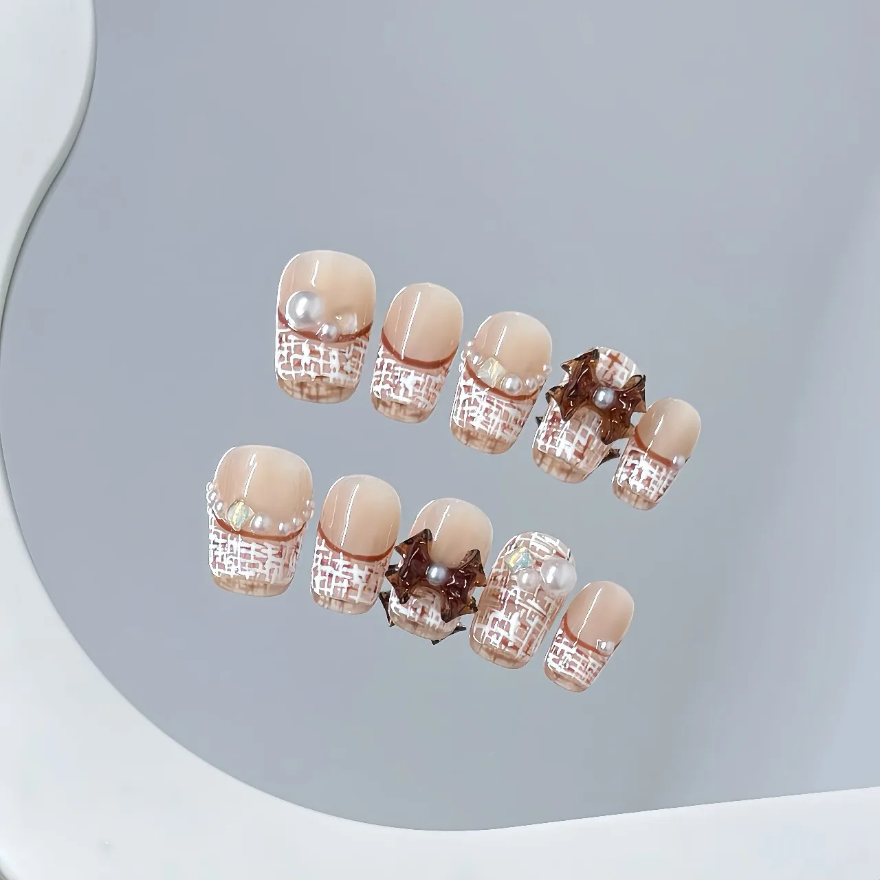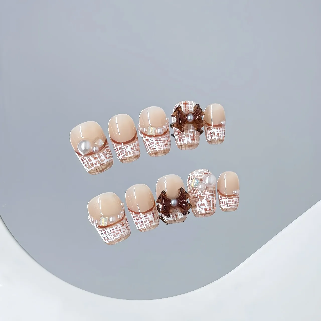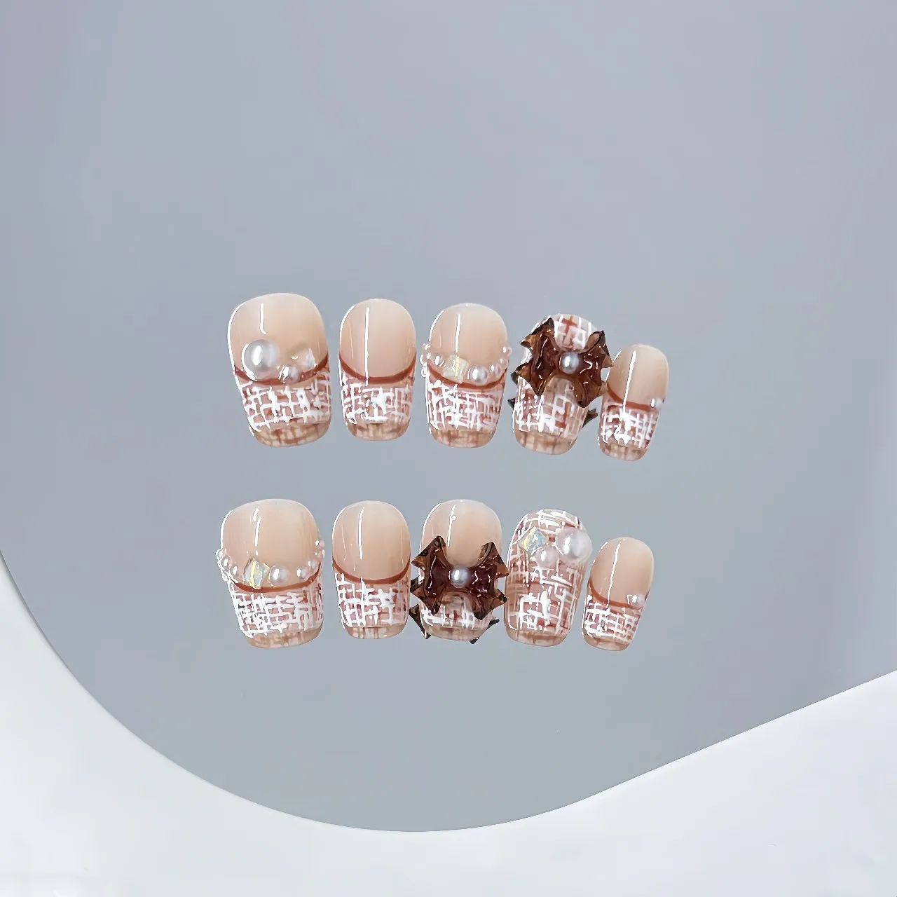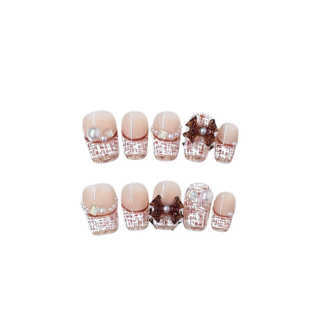 Yeknu 10pcs Handmade Short French Press on Nails Retro 3D Red Bow Pearl Decor False nails European Winter Wearable Fake Nail Tips
