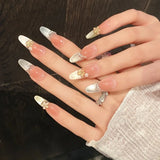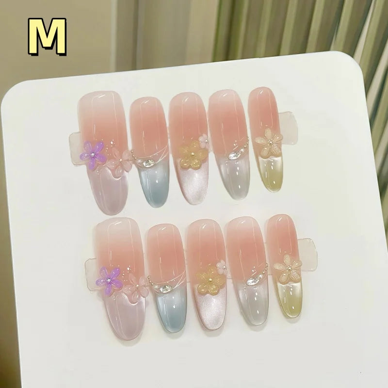 Yeknu 10Pcs Long Oval Handmade Press-On Nails Rainbow Cat-Eye Effect with 3D Flower Designs Perfect for Women&girls Daily Nail Wear