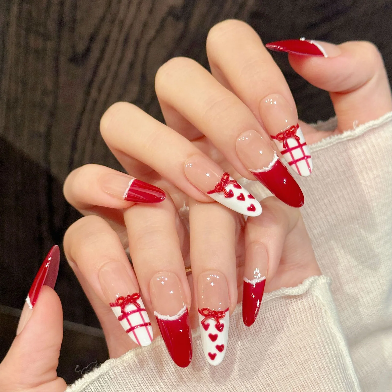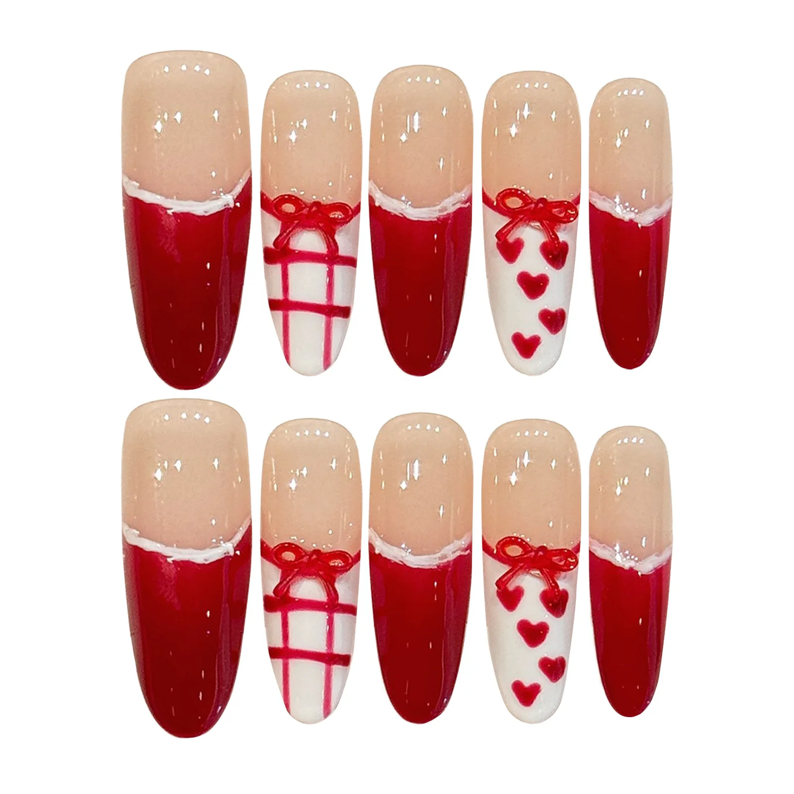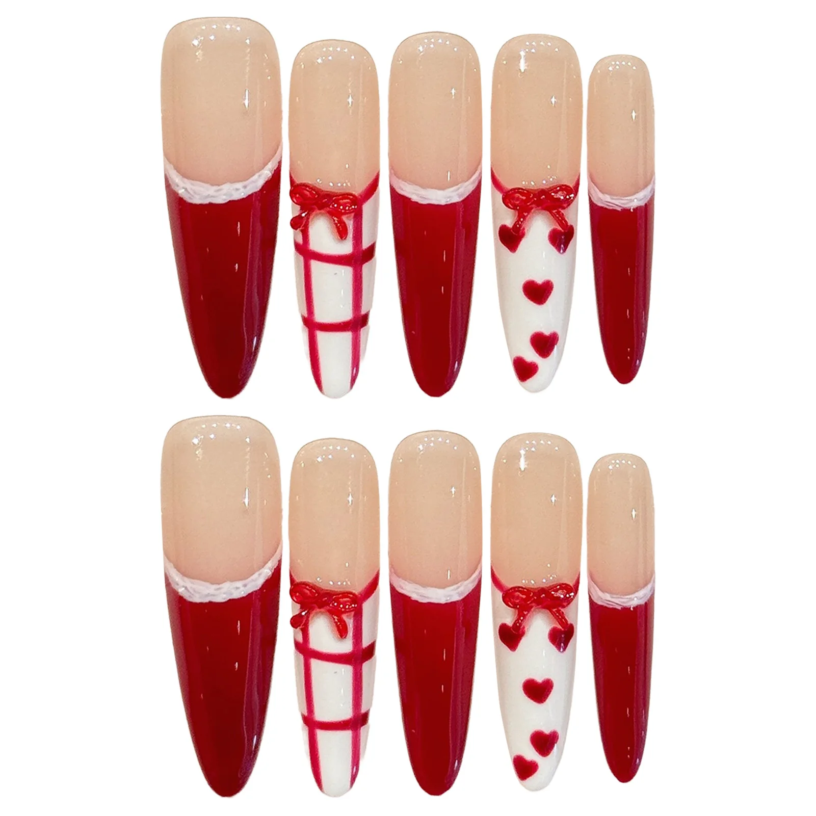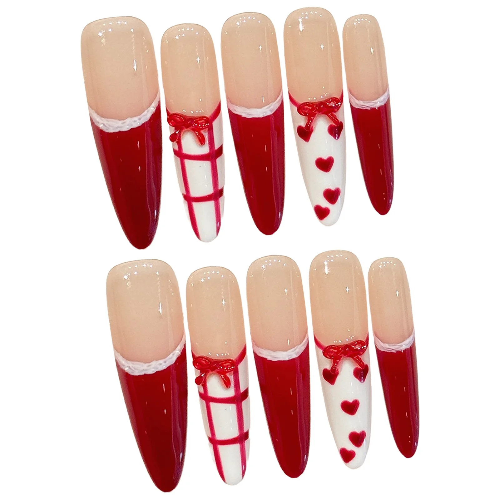 Yeknu 10pcs Red French Handmade False Nails INS Love Heart Design Fake Nail Tips Lady Women Wearable Long Oval Press on Nails