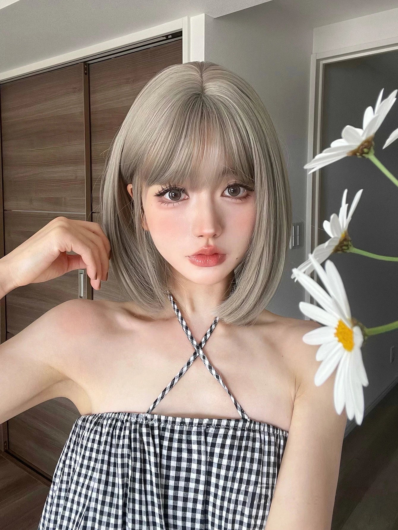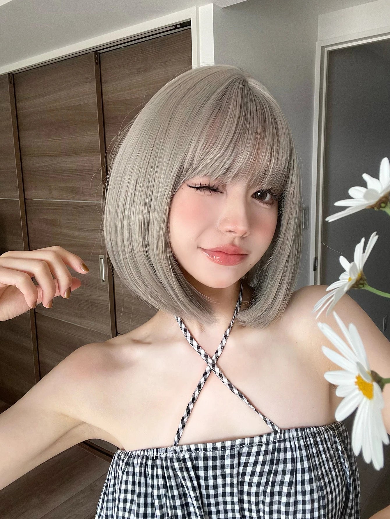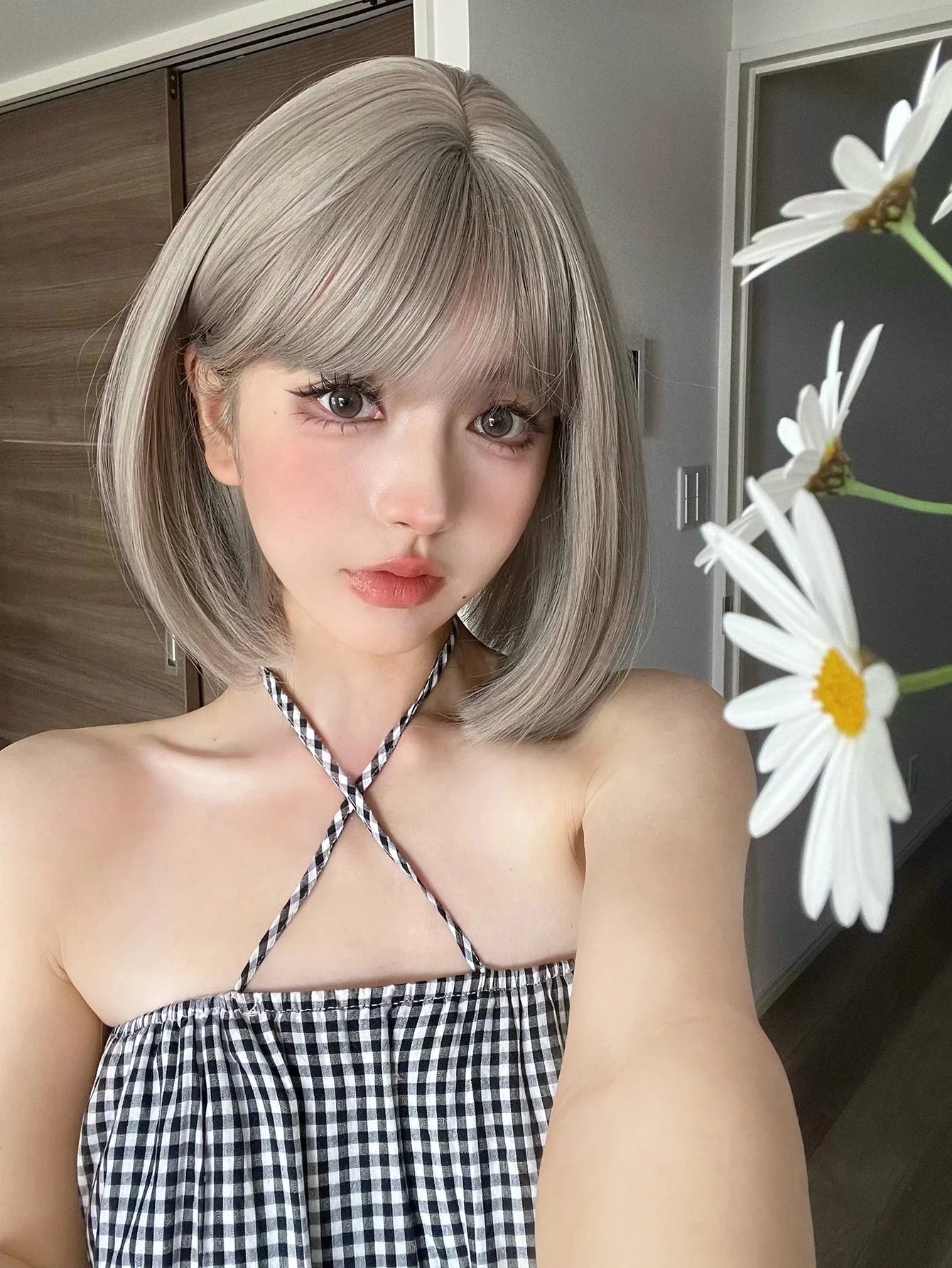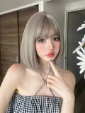 Yeknu 12Inch Gridelin Color Synthetic Lolita Wig With Bang Medium Natural Straight Hair Wig for Women Daily Cosplay Heat Resistant