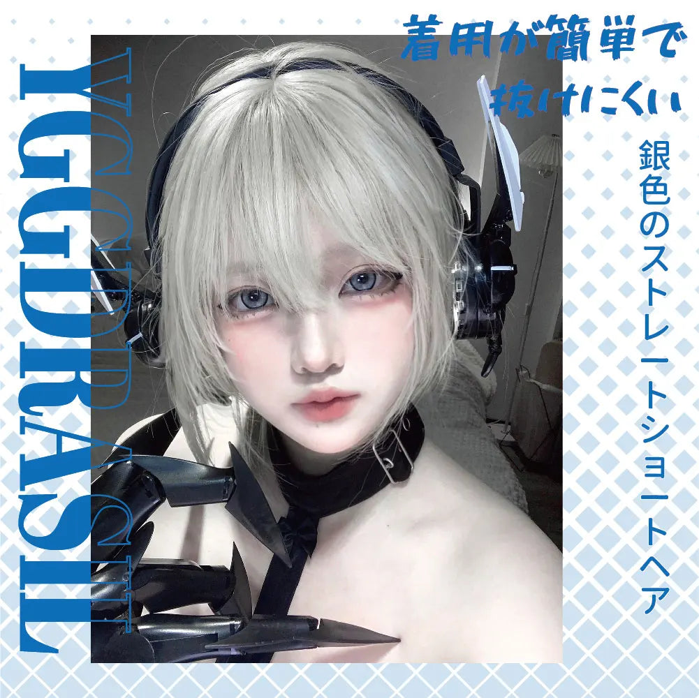 Yeknu 14Inch Mechanical Princess Silver Gray Synthetic Wigs with Bang Short Straight Hair Wig for Women Daily Cosplay Heat Resistant