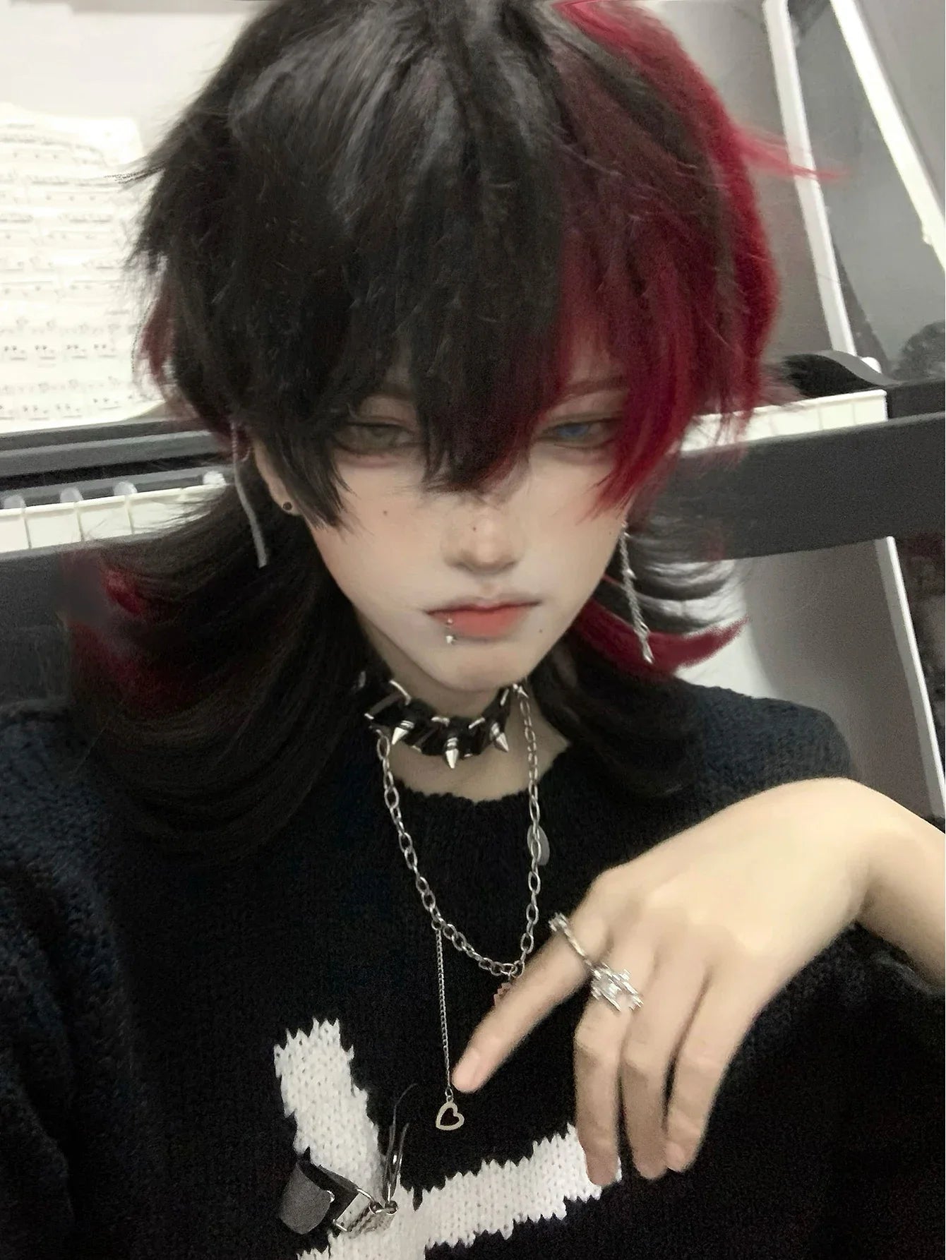 Yeknu 16Inch Black and Red Color Handsome Synthetic Wig With Bang Medium Natural Wavy Hair Wig for Man or Women Cosplay Heat Resistant