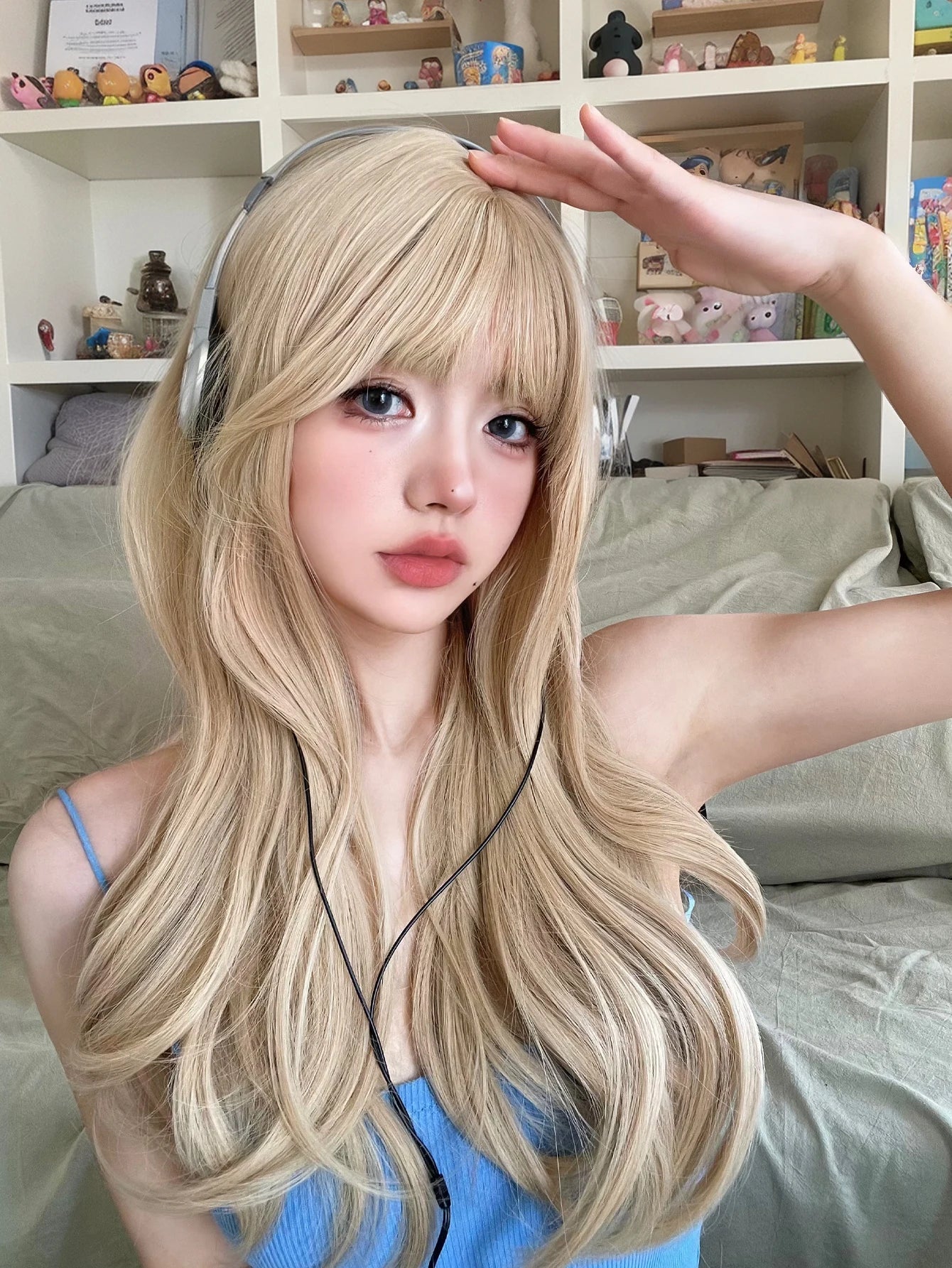 24Inch Blonde Lolita Style Synthetic Wigs With Bangs Long Natural Wavy Hair Wig for Women Daily Use Cosplay Party Heat Resistant
