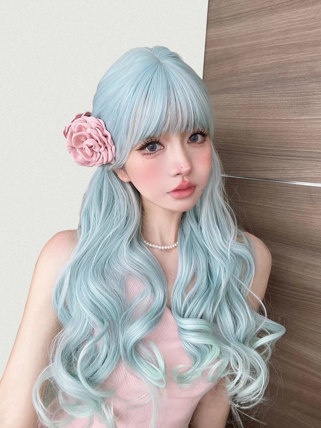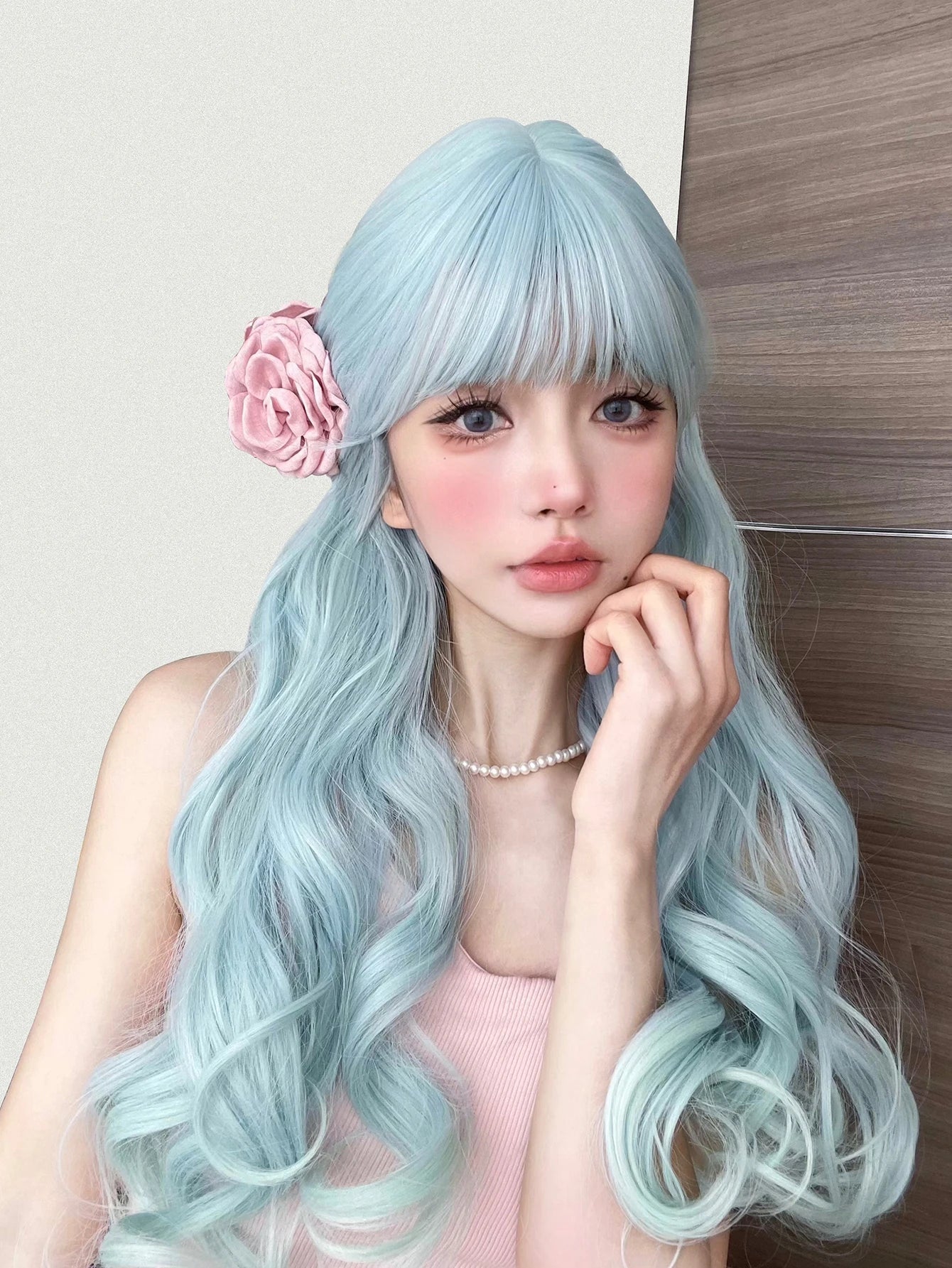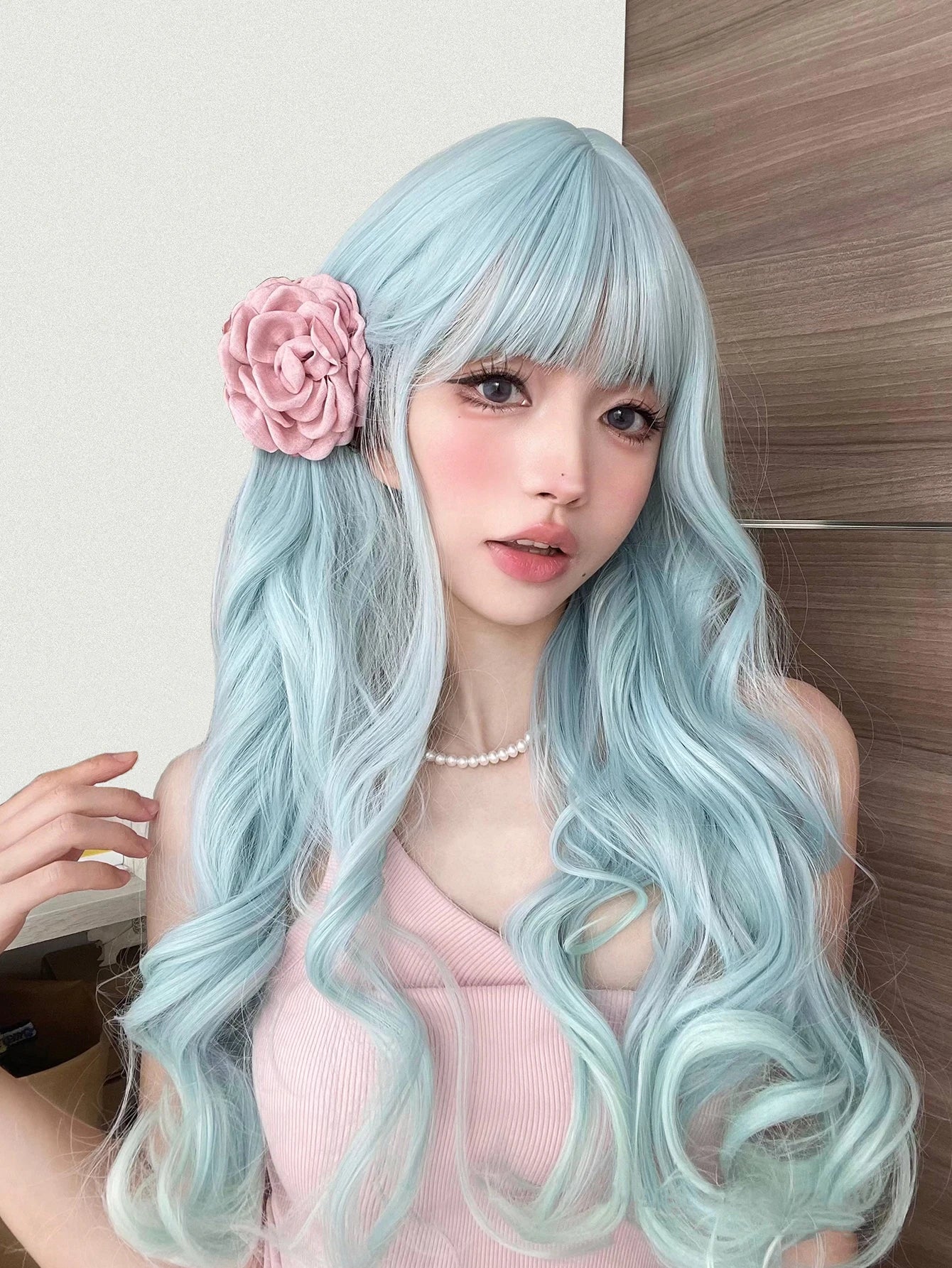 24Inch Sky Blue Refreshing Lolita Synthetic Wigs With Bang Long Natural Wavy Hair Wig For Women Daily Cosplay Heat Resistant