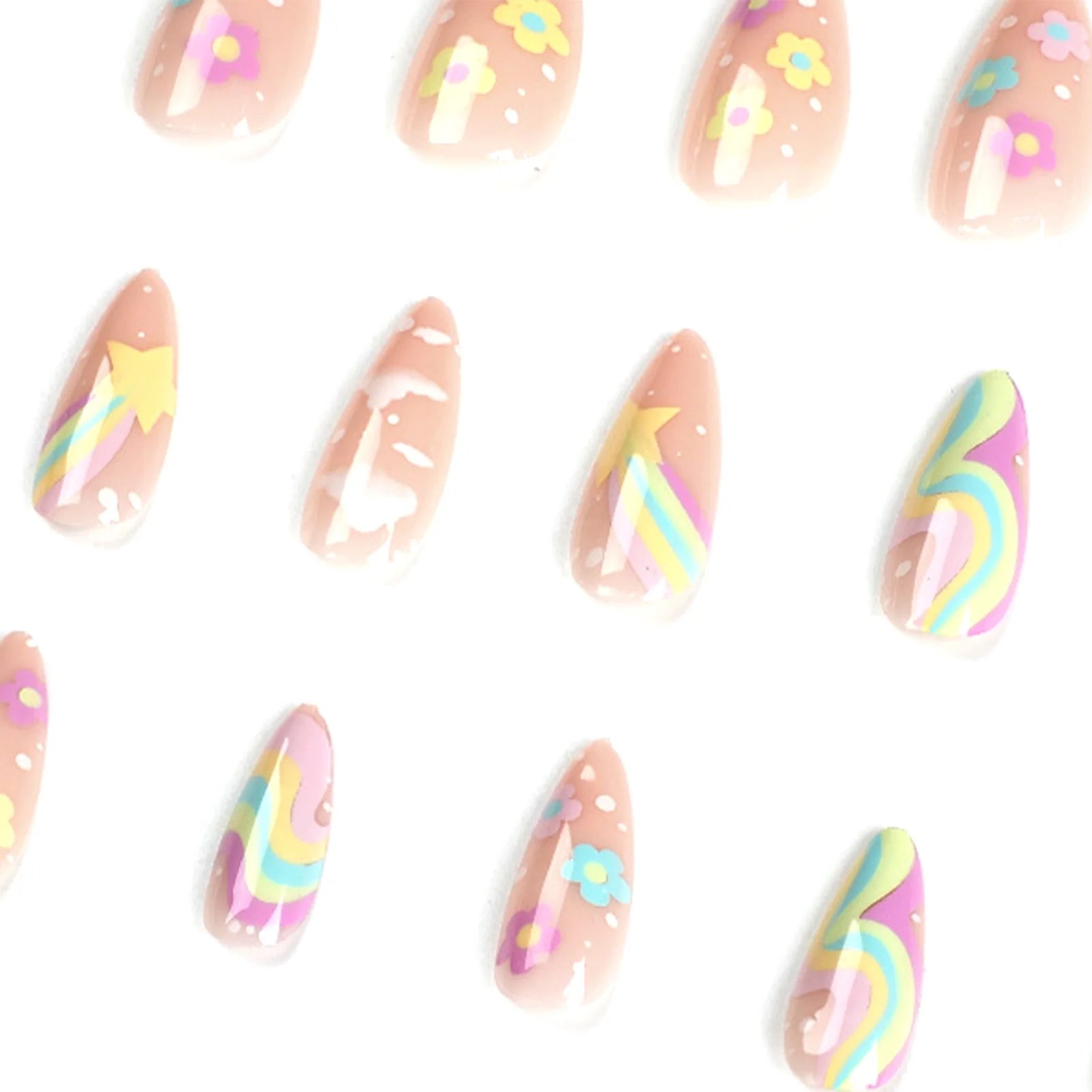 Yeknu 24pcs Cute Colorful False Nail Tips for Girl Rainbow Cloud Star Printed Almond Fake Nails Full Cover Reusable Adhesive Fake Nail