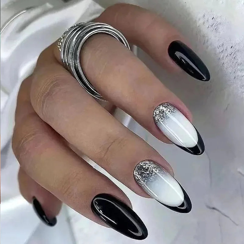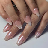 24Pcs Long Almond Fake Nails with White Edge Design Wearable French Press on False Nails Simple Full Cover Nail Tips Manicure