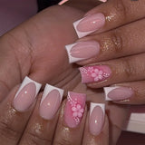 24Pcs Nude Pink French False Nails Press on Short Square Head Stick on Nails with Flower Pattern Design Wearable Fake Nail Tips