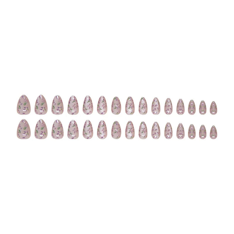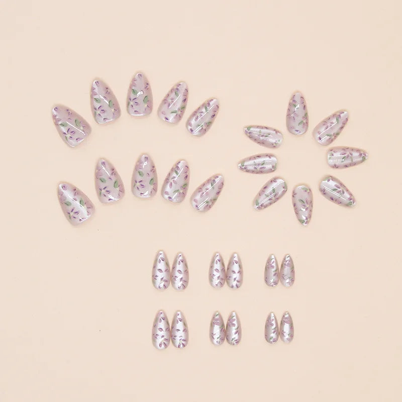 Yeknu 24Pcs Purple Cat's Eye Press on Almond Nails with Delicate Floral Designs Romantic Fasle Nail Tips for Women&Girls Elegance Wear