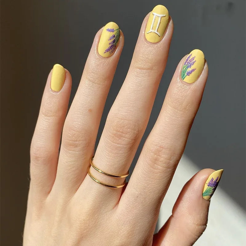 Yeknu 24Pcs Short Almond False Nails with Glue Colorful Flowers Design Fake Finger Nails Wearable Artificial Oval Press on Nails