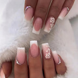 24Pcs White French Fake Nails with Butterfly Rhinestone Design Short Ballet Press on False Nails Square Wearable Jelly Stick-ons
