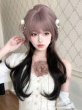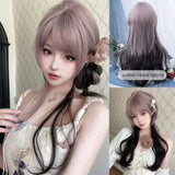 28Inch Ash Purple Highlight Black Lovely Synthetic Wigs with Bangs Long Straight Hair Wig for Women Daily Use Heat Resistant