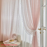 Yeknu 2pcs Pink Lace Ruffle Curtains] 2pcs Aifish Pink Lace Tulle Ruffle Curtains - Double Layer Beaded Voile Sheer with Rod Pocket, Romantic Window Decor for Bedroom & Living Room, Polyester Fabric, Curtains for Bedroom