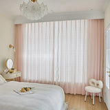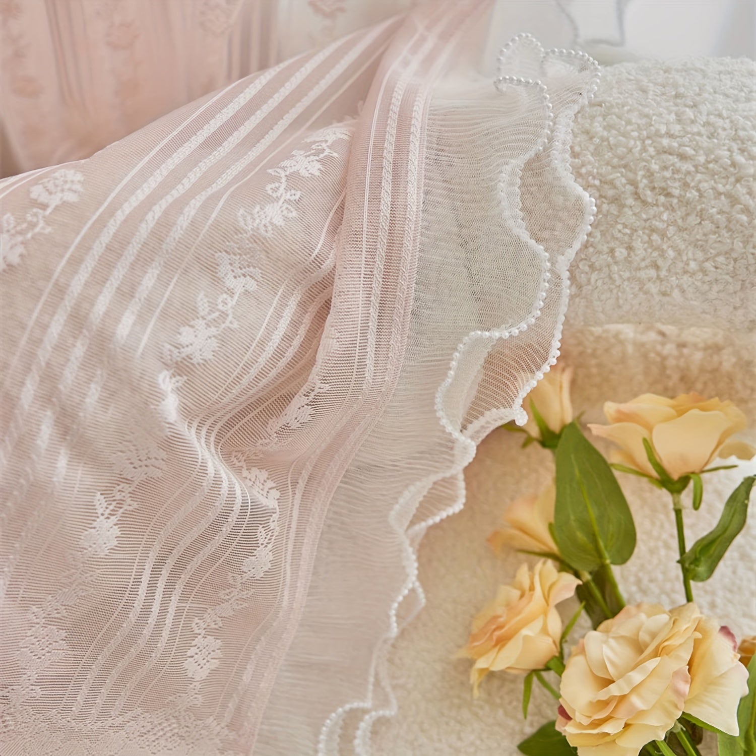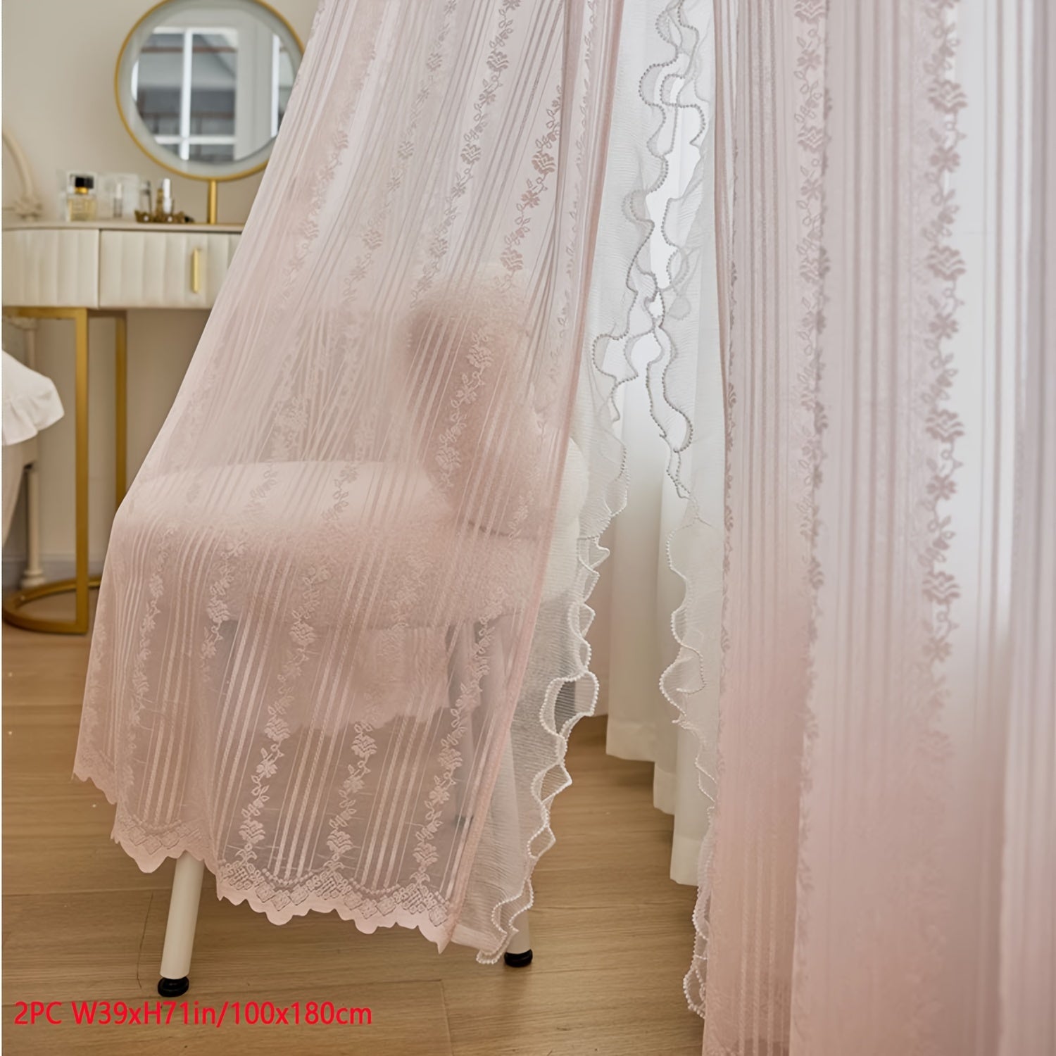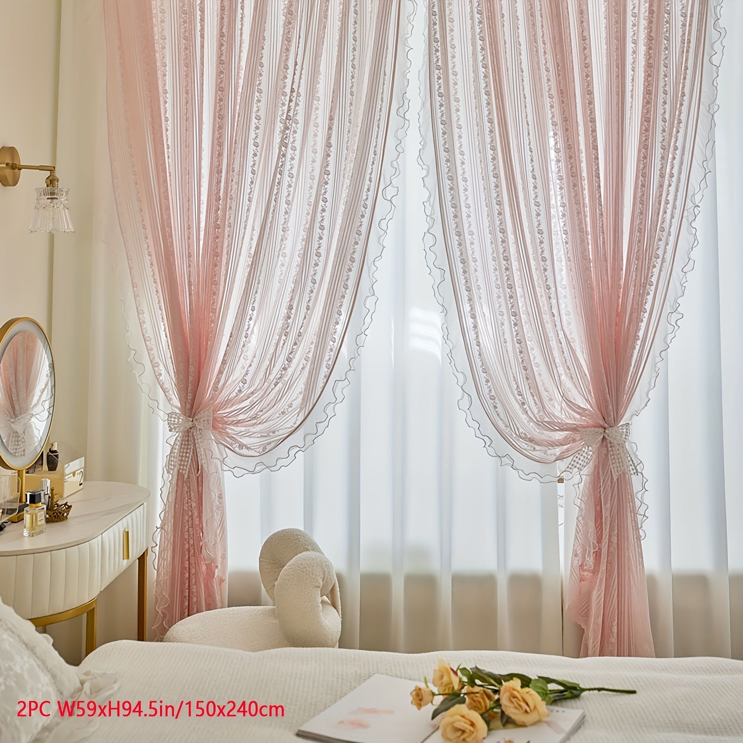 Yeknu  2pcs Pink Lace Ruffle Curtains] 2pcs Aifish Pink Lace Tulle Ruffle Curtains - Double Layer Beaded Voile Sheer with Rod Pocket, Romantic Window Decor for Bedroom & Living Room, Polyester Fabric, Curtains for Bedroom