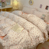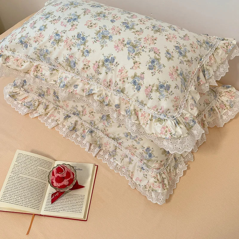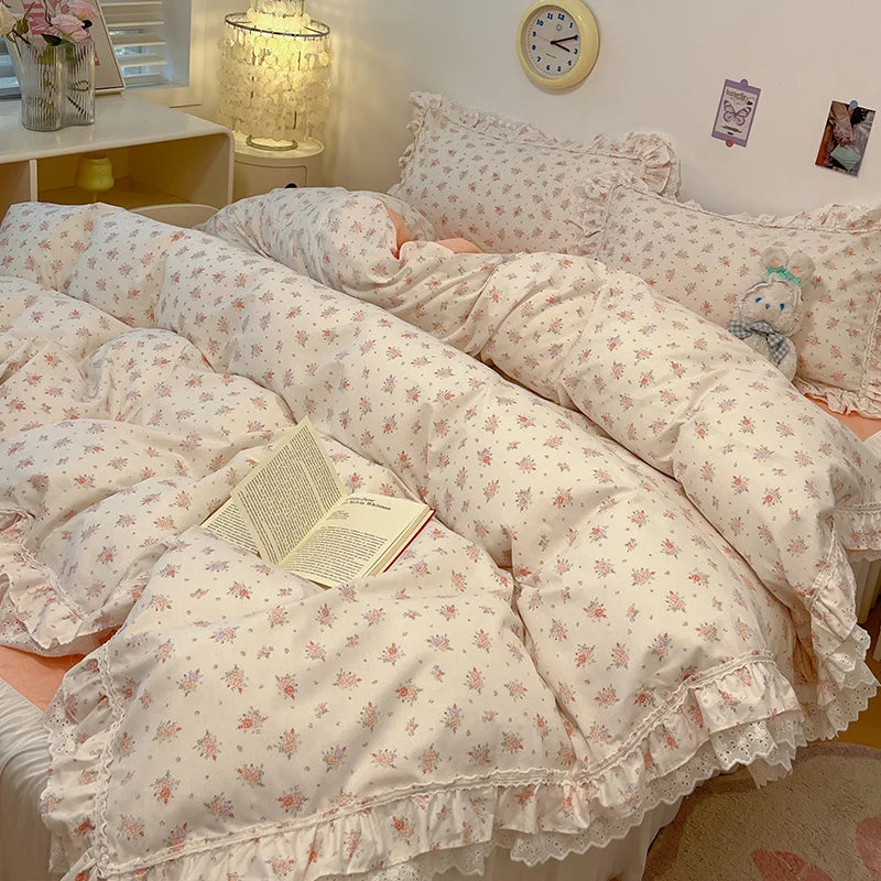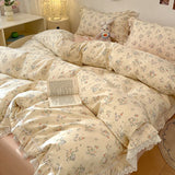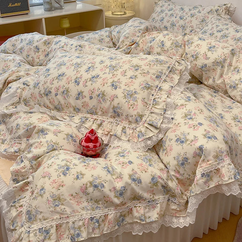 Yeknu 4Pcs Vintage French Fresh Floral Lace Ruffles 100% Cotton Bedding Set Duvet Cover Bed Skirt/Bed Sheet/Fitted Sheet Pillowcases
