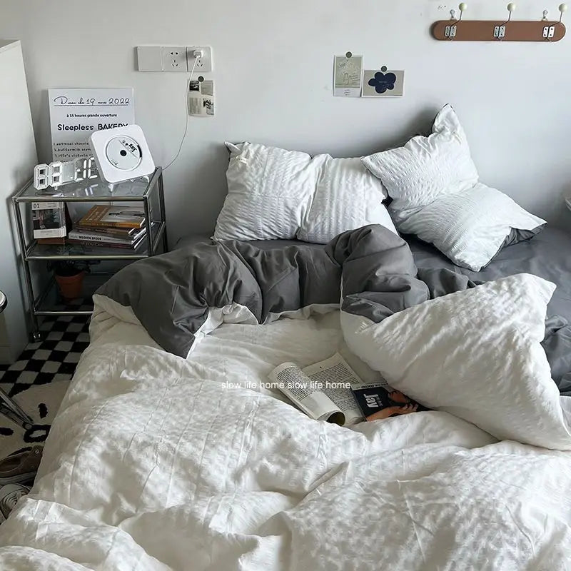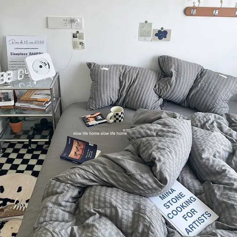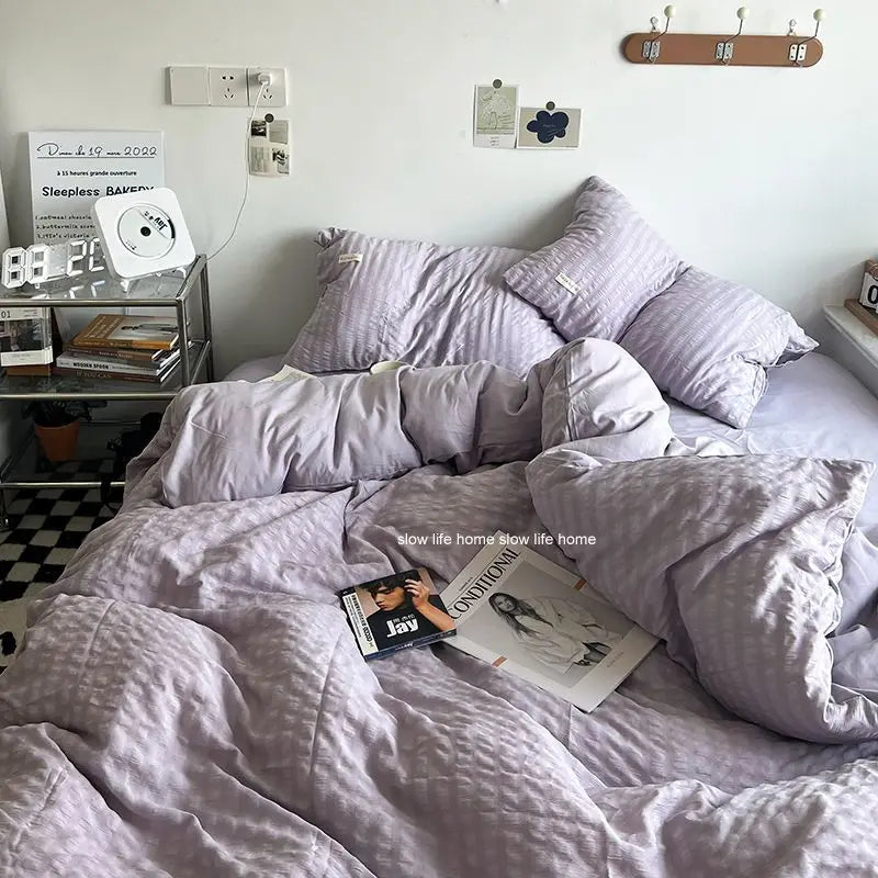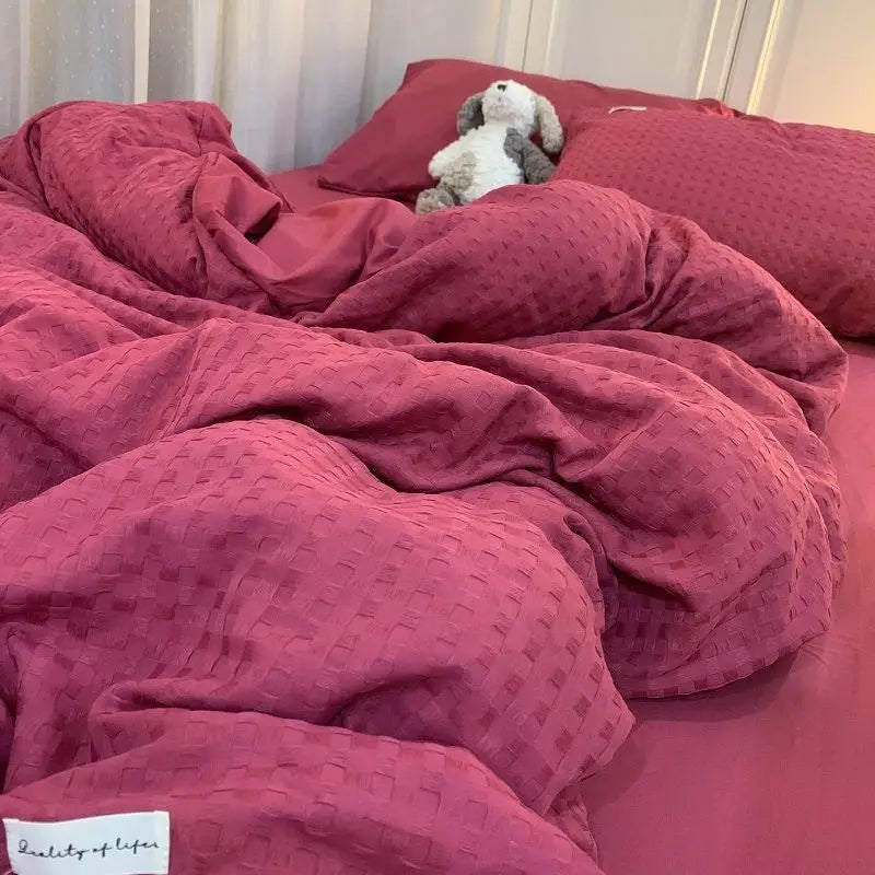 Yeknu Bedding Set Luxury High Grade Light Washable Cotton Waffle Four Piece Olive Green Quilt Cover Bed Sheet Dormitory Three Piece