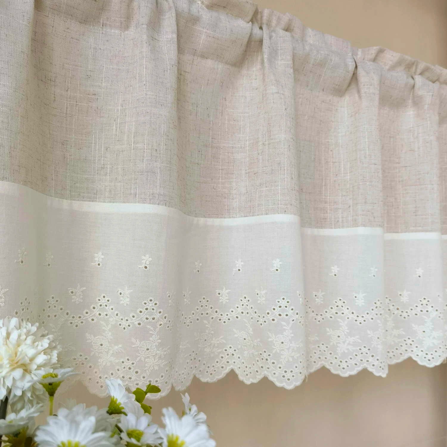Yeknu Beige Splicing Short Curtains Valance For Kitchen Cafe Barrier Natural Linen Blended Semi-translucent Small Half Curtain Voile