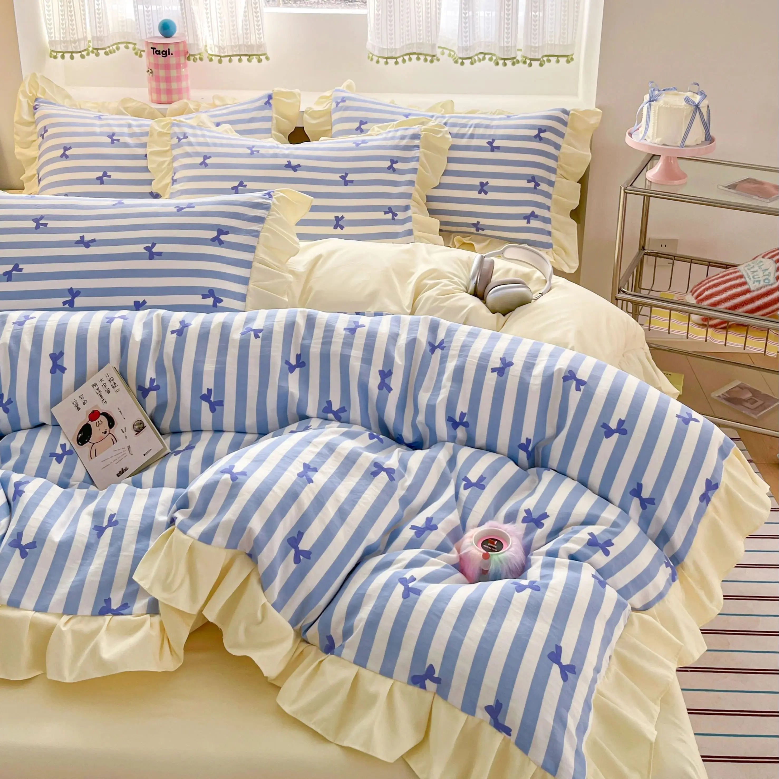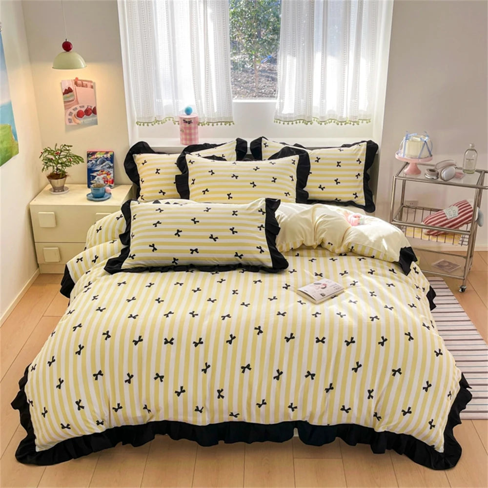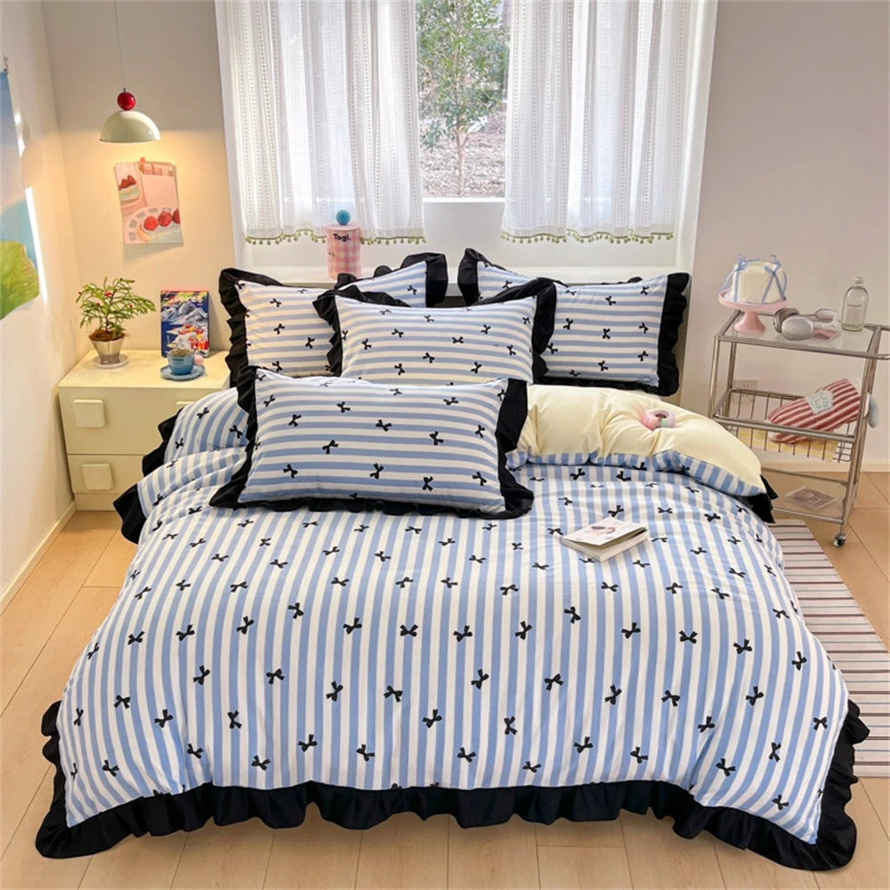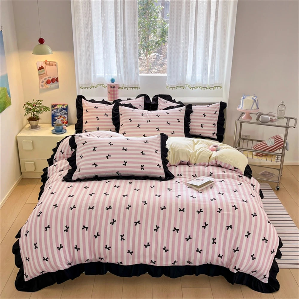 Yeknu Black Lace Ruffles Korean Bow Decor Bedding Set Duvet Cover Pillowcase Washed Cotton Four-Piece Sets Soft Quilt Cover Bed Sheet